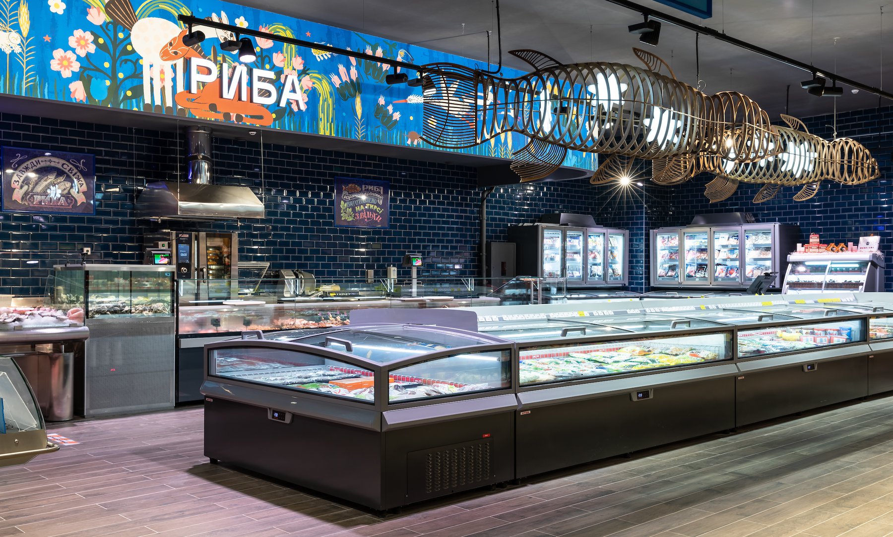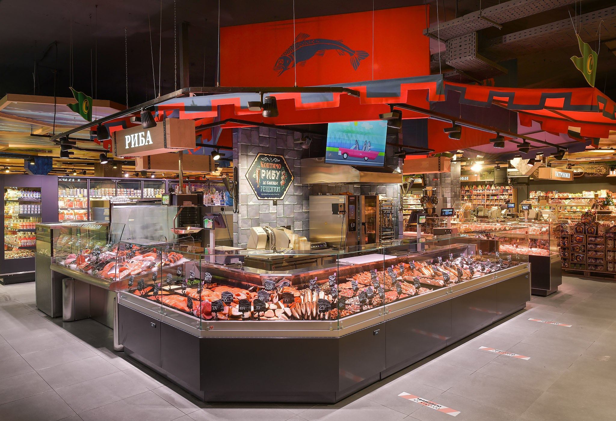 У рибному відділі можна вибрати чорну та червону ікру, морепродукти на льоду, балики та червону рибу або замовити копчення. Тут також є оливковий бар та велика зона з продуктами «Лавка традицій», бутик з хамоном і послугами кортадора та страви з грилю, де можна замовити шашлик.