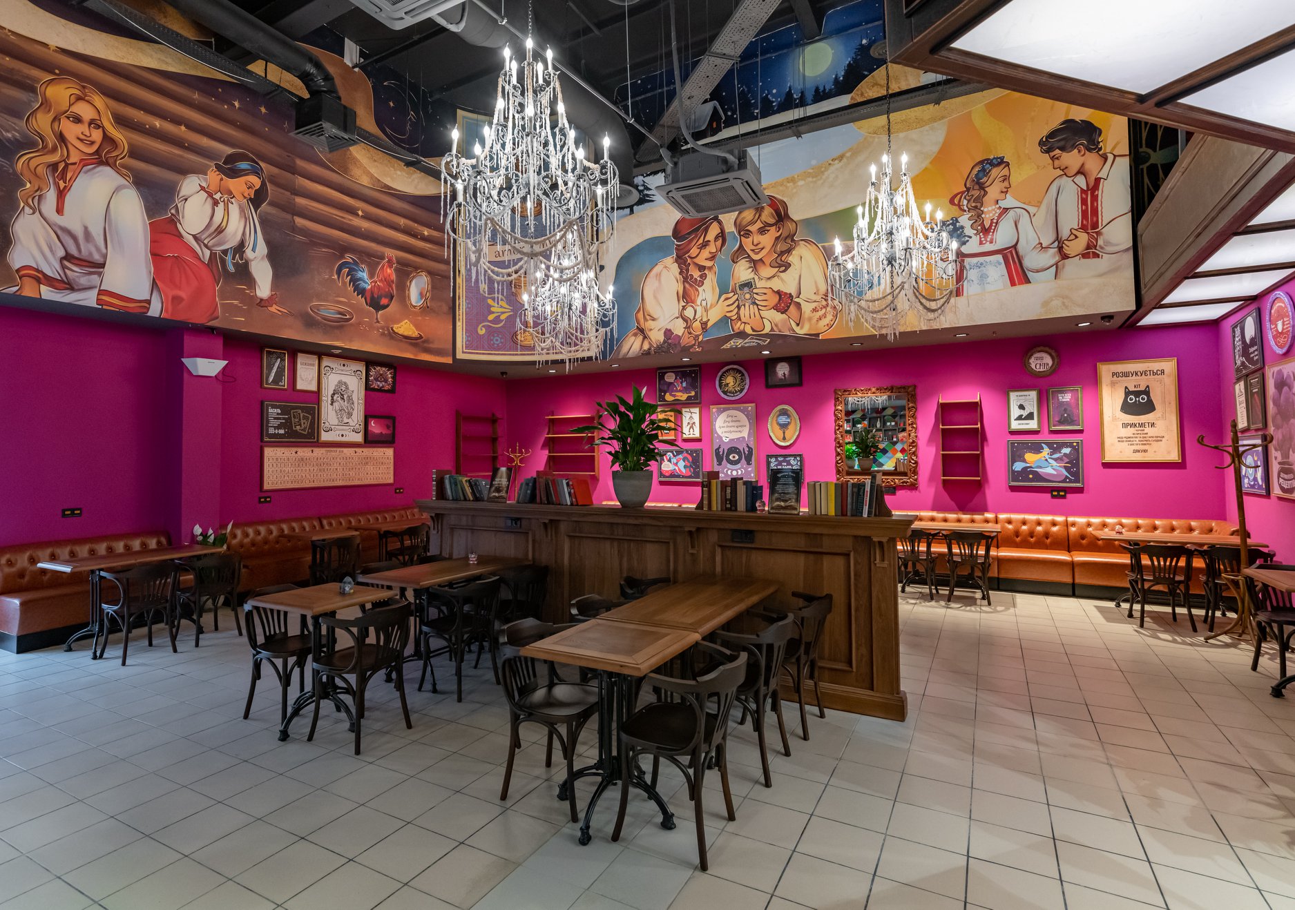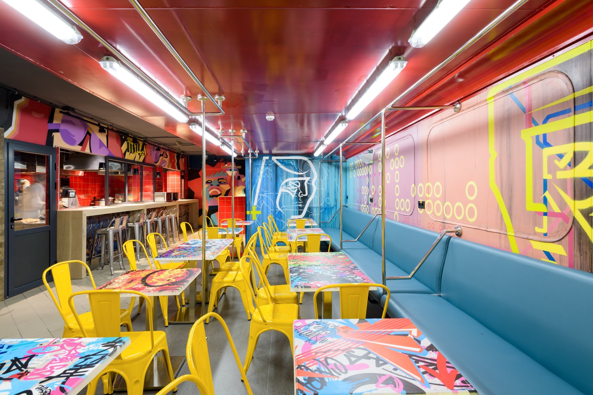 Всередині є концептуальне кафе, що відтворює вагон нью-йоркського метро, яке свого часу стало місцем комунікації андеґраундних креаторів. Розпис нагадує холкар (холкар ― сленг з англ. whole car), що створений не на вагоні метро ззовні з повністю зафарбованими вікнами, а, навпаки, перенесений усередину інтер’єру.