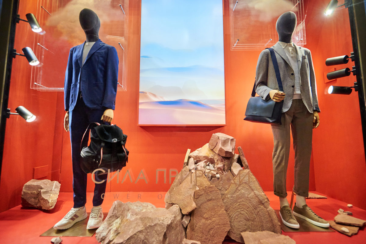 Креативна команда ЦУМ відтворила різноманітні природні ландшафти, акцентуючи увагу на важливості дбайливого та свідомого ставлення до ресурсів нашої планети. Весняні вітрини наповнені повітрям і простором, кольорова гама спокійна та збалансована. У процесі створення сюжетів використовувались насичені натуральні відтінки та фактури: камінь, дерево, рослини. В семи вітринах відобразили елементи гірських порід, мінливість водної стихії, мальовничу палітру неба та рослинний світ.