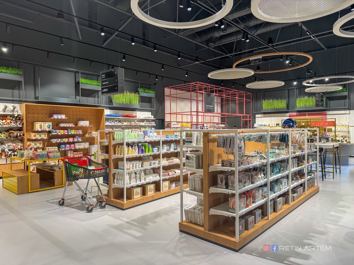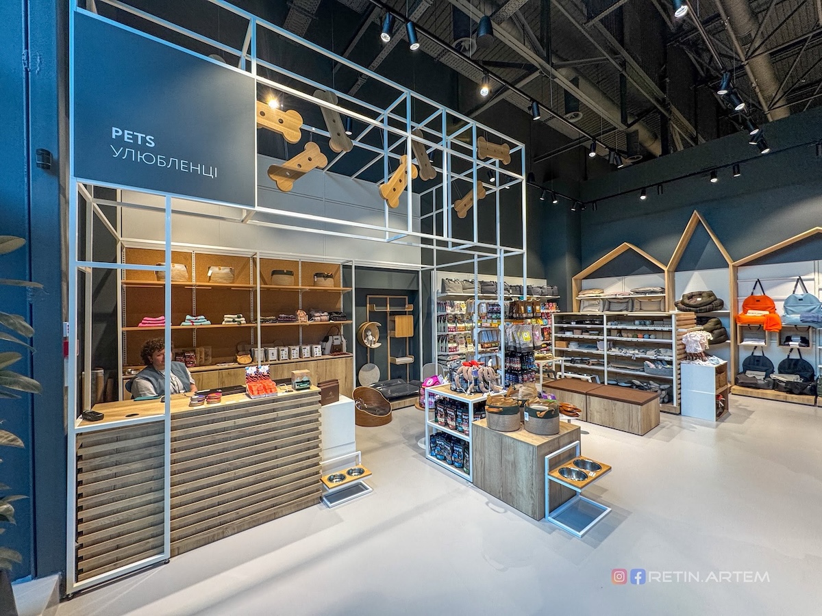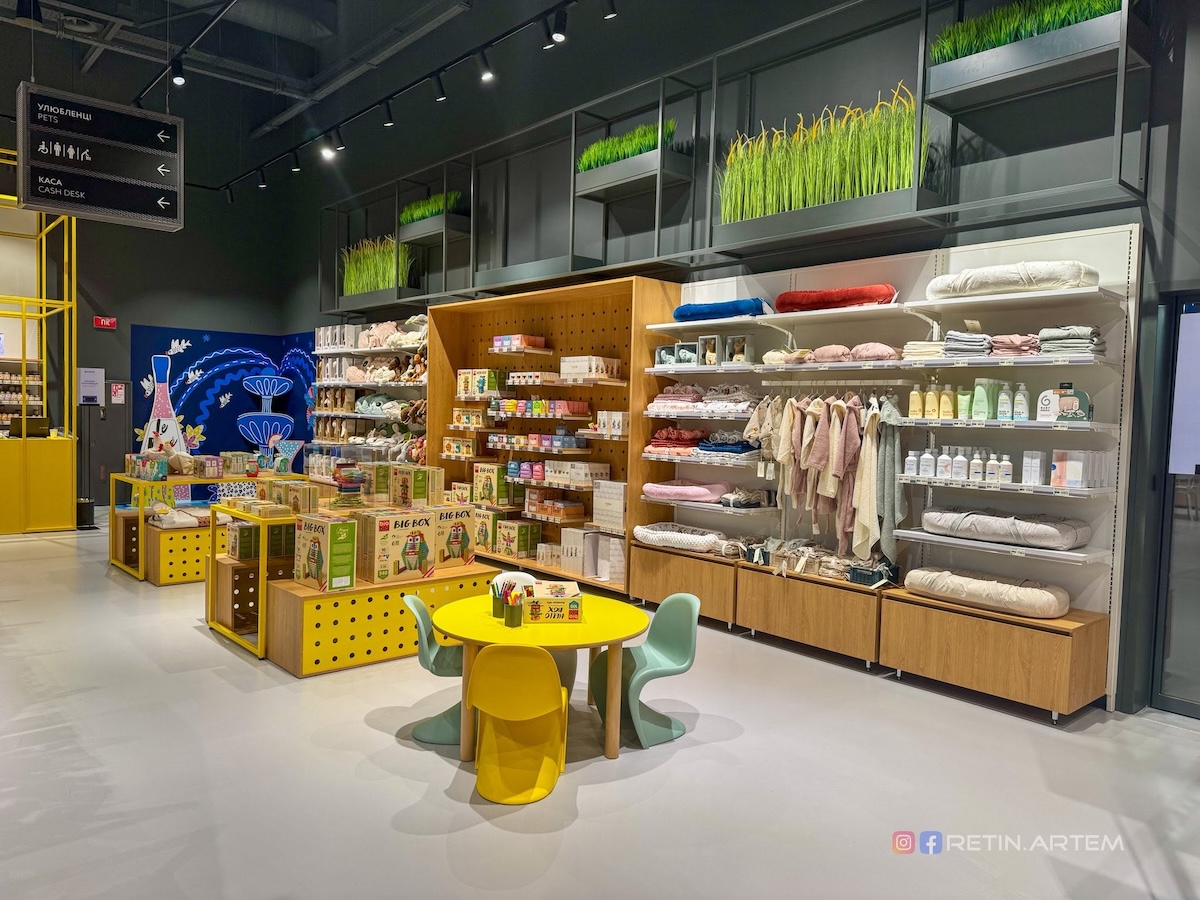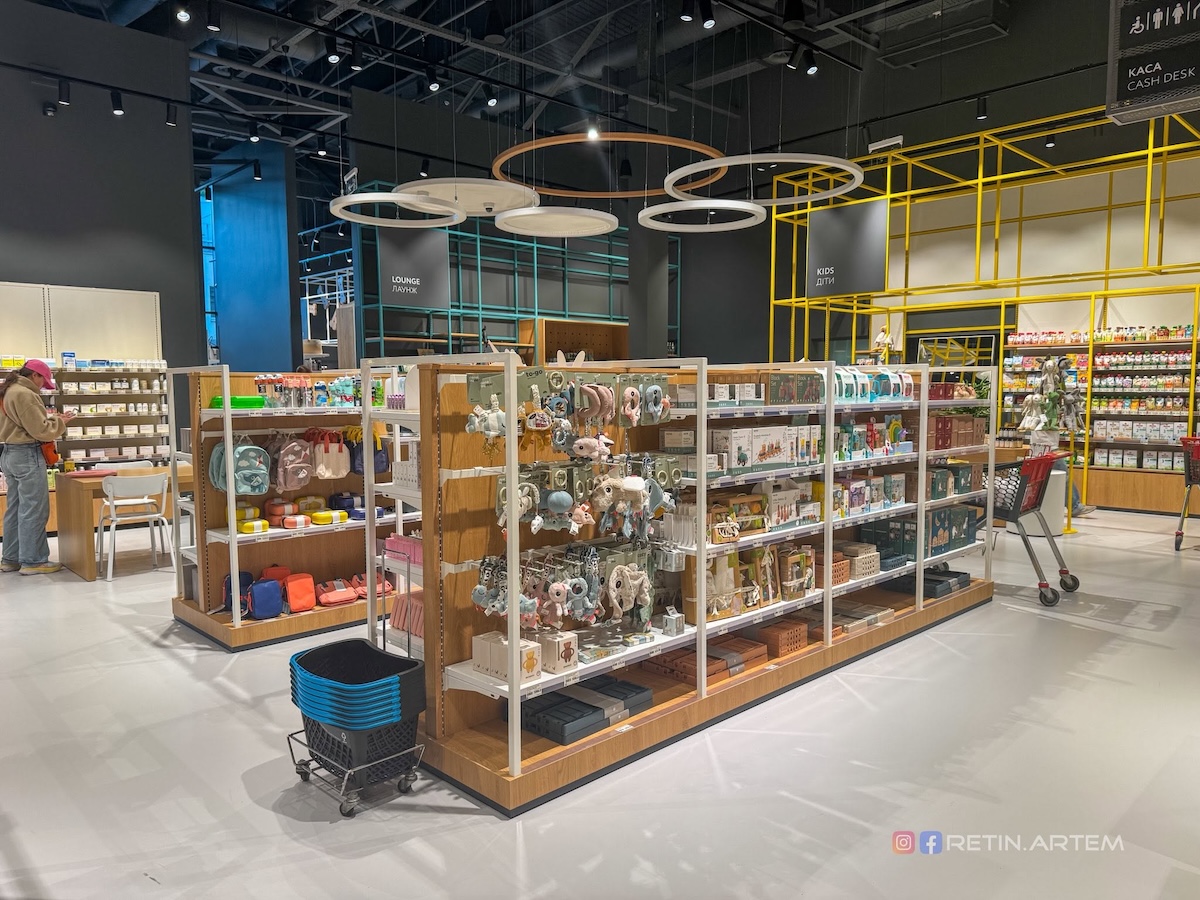 Дизайн магазину — окрема тема, яка заслуговує на увагу. Ще на стадії візуалізацій він привернув увагу своєю нетиповістю для українського ритейлу. У просторі вдало поєднані бетон, дерево, метал і текстиль, що створює баланс між функціональністю та естетикою.