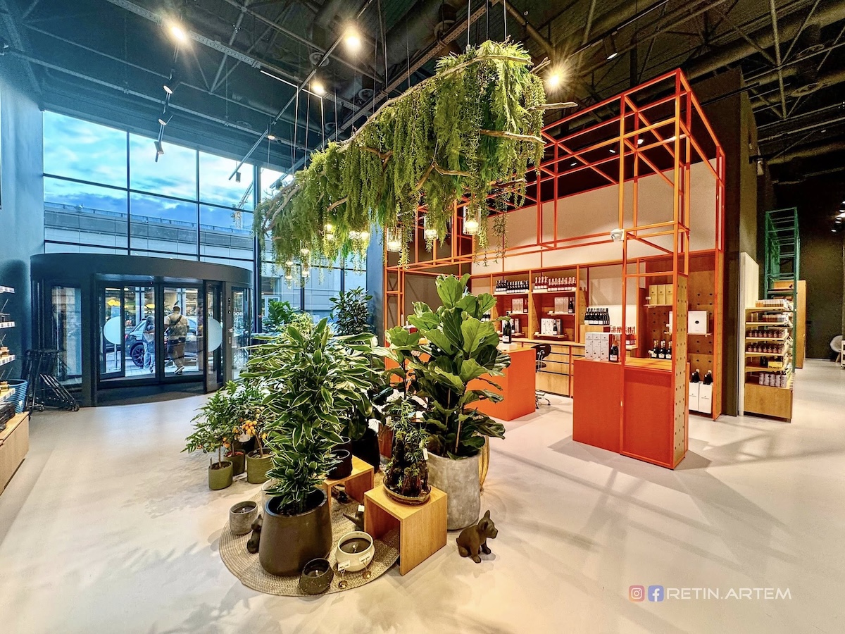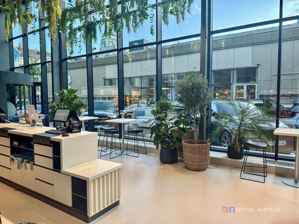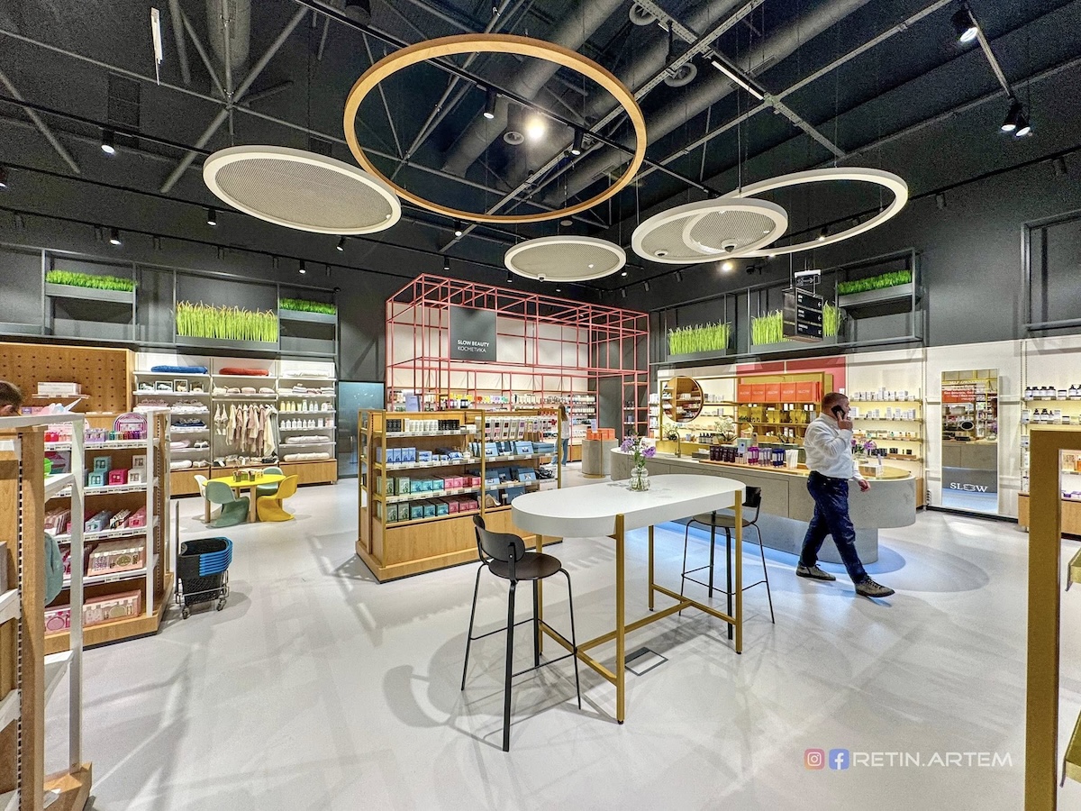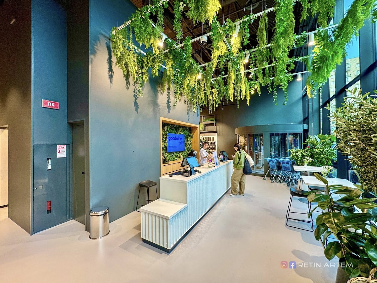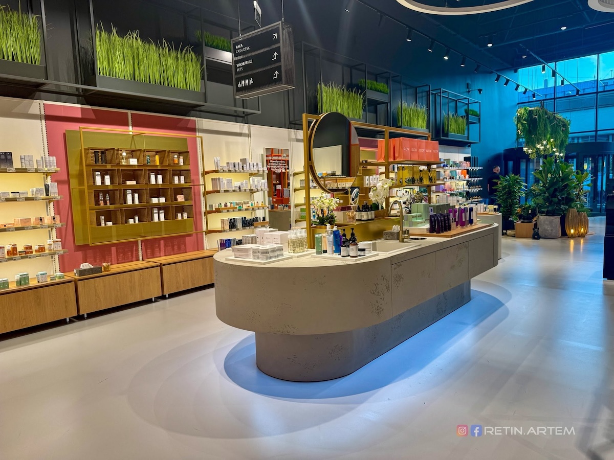 Озеленення (у тому числі підвісне) додає «живого» ефекту, а дзеркала з цитатами, м’яке освітлення й інстаграмні «острівці» з товарами створюють дружню, сучасну атмосферу.