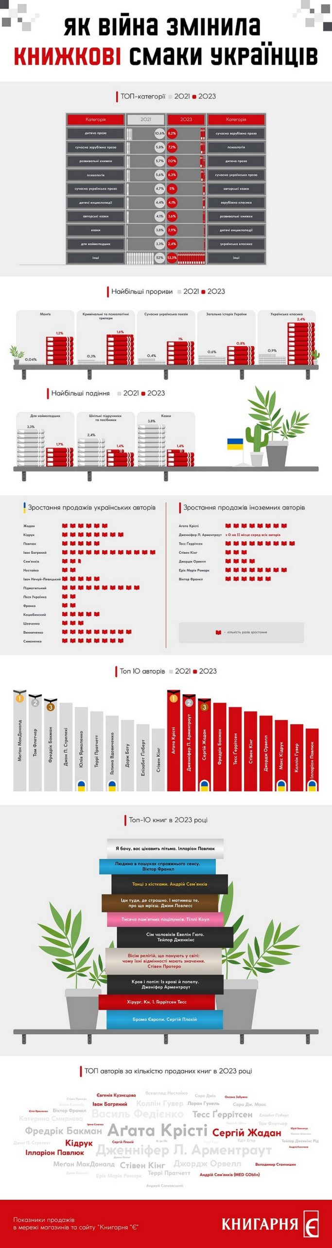 - Найпопулярнішою категорією до війни була дитяча проза. У 2023 році лідером стала сучасна зарубіжна проза, а проривом минулого року можна вважати українську класику, яку все частіше почали обирати читачі. На другому місці – кримінальні та психологічні трилери;