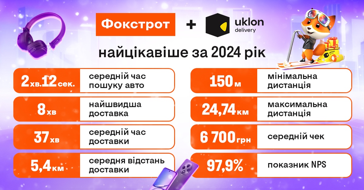 Мережа електроніки Фокстрот та сервіс доставки Uklon Delivery підбили підсумки своєї взаємодії у 2024 році. Одна з головних переваг сервісу – це швидкість доставки. Для багатьох покупців важливо не лише знайти потрібний товар, але й отримати його якнайшвидше. А завдяки широкому покриттю у 27 великих містах та їх передмістях України, клієнти можуть швидко отримати свої покупки вже протягом години. Найбільшим попитом послуга користується серед жителів Києва, Львова, Одеси, Харкова і Дніпра. Рекорд найшвидшої доставки – 8 хвилин. У середньому з моменту оформлення замовлення на сайті до отримання клієнтом проходить 47 хвилин. Середній чек – 6700 грн.