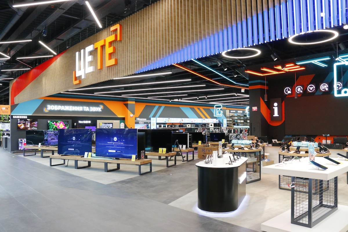 Загальна площа складає 1350 кв. м, торгівельна – 920 кв. м. Серед представлених бренд-зон – телевізори від Samsung і TCL, велика побутова техніка від LG, Samsung, Whirlpool, дрібна побутова техніка від Tеfаl, Philips, DeLonghi.