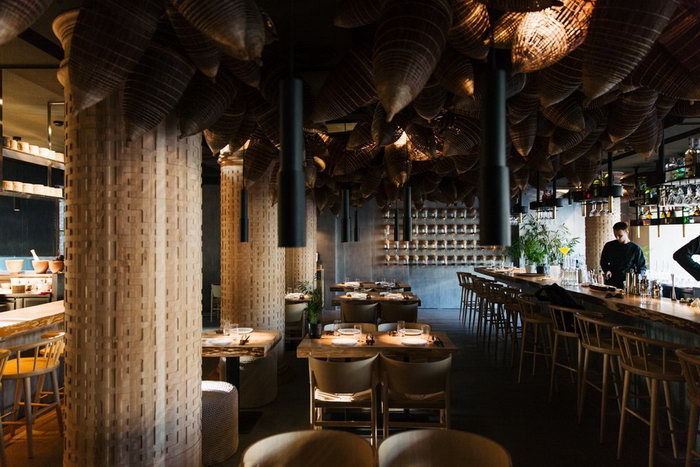 Центральним елементом інтер’єру ресторану виступає композиція на стелі, виконана з 600 декоративних рибальських сіток і бамбука. Матеріали були привезені спеціально з В’єтнаму. Ще одна гордість – декоративна стіна з 52 спецій, які використовуються в стравах Spicy NoSpicy.