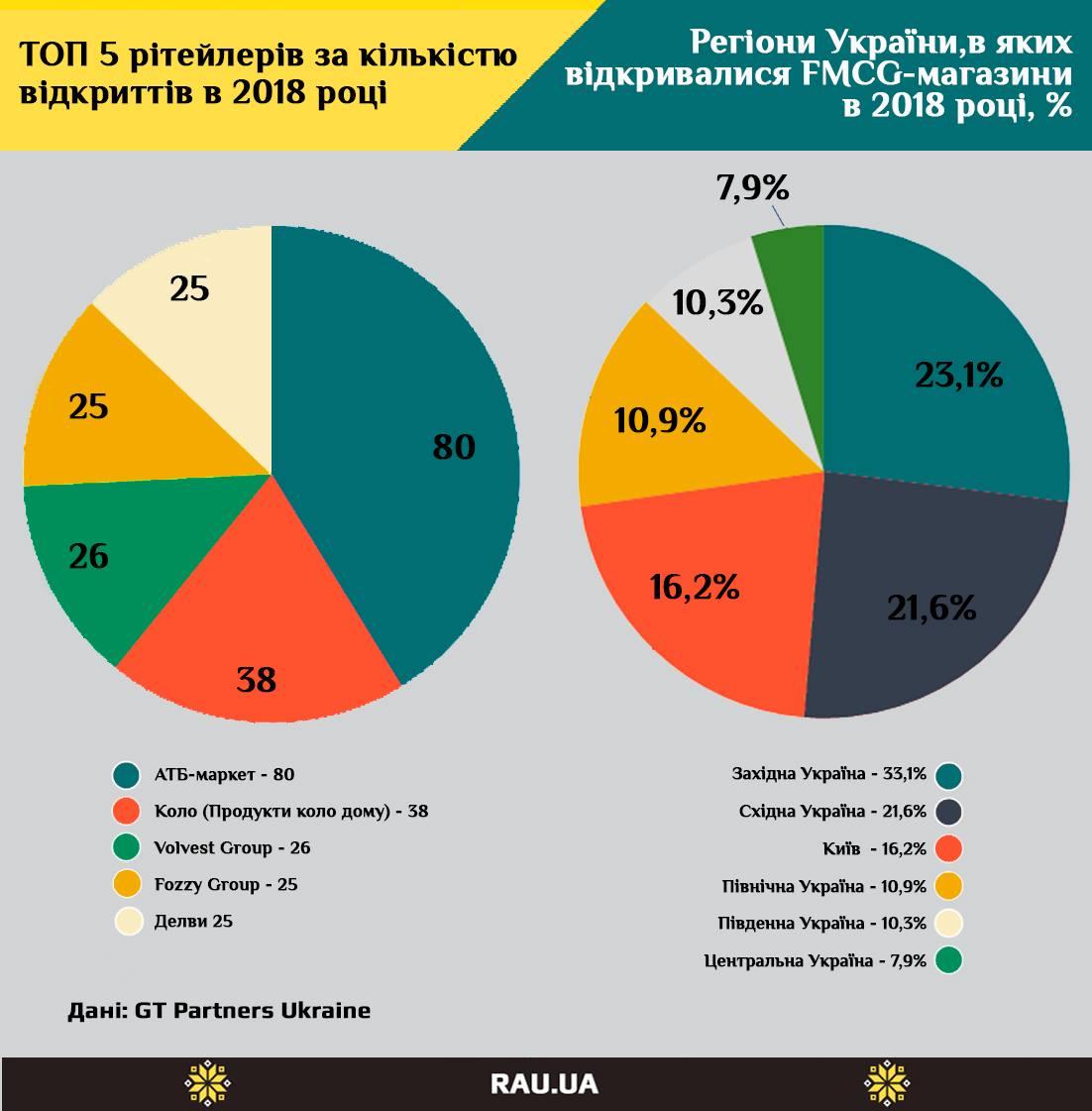 Тим часом, дослідницька компанія GT Partners Ukraine представила чергове масштабне дослідження, присвячене основним тенденціям розвитку українського продуктового рітейлу в 2018 році. Крім загального огляду – скільки магазинів входить в провідні FMCG-мережі – аналітики також дослідили, хто з компаній найактивніше відкривав торговельні точки в 2018 році, а також в які регіони рітейлери воліли виходити. За інформацією GT Partners, лідерами продуктового рітейлу України за кількістю нових відкриттів стали компанії АТБ-маркет, КОЛО і Volvest Group.