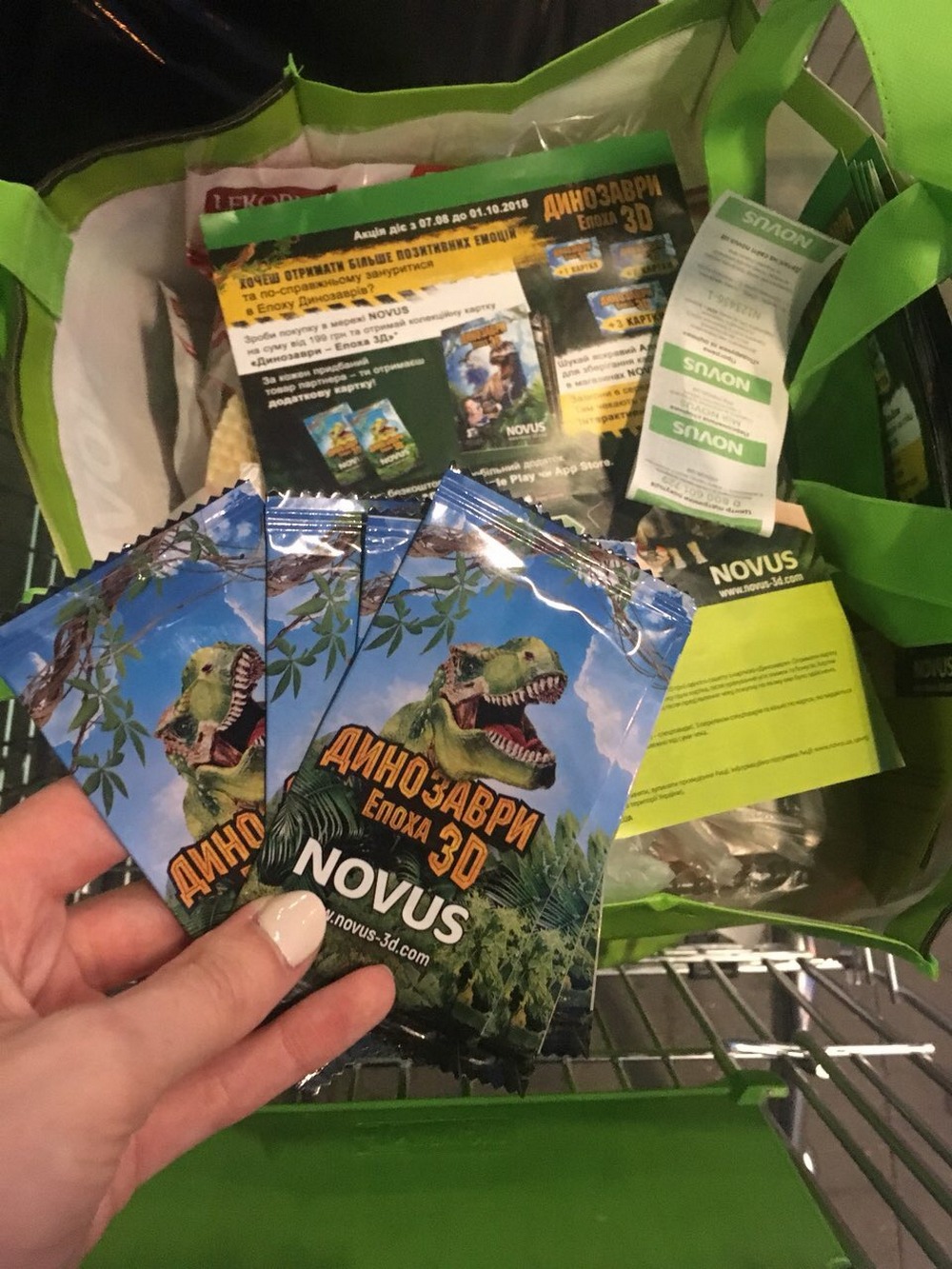 Олександр: При покупці в магазинах мережі Novus за кожні 199 гривень людина може отримати закритий сошет, де знаходиться картка з тим чи іншим динозавром. Також додаткові картки можна отримати, купивши певний товар партнера акції. Щотижня товари партнерів змінюються, змінюються й умови. Тобто в одному випадку можна отримати одну бонусну картку, а в іншому – дві або три. Вся інформація про акцію та актуальні партнерські товари міститься в газеті та на інформаційних стендах. Також можна проконсультуватися у продавця або іншого працівника Novus чи дізнатися подробиці на сторінці акції.