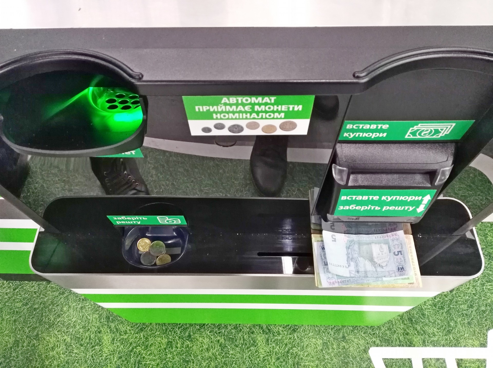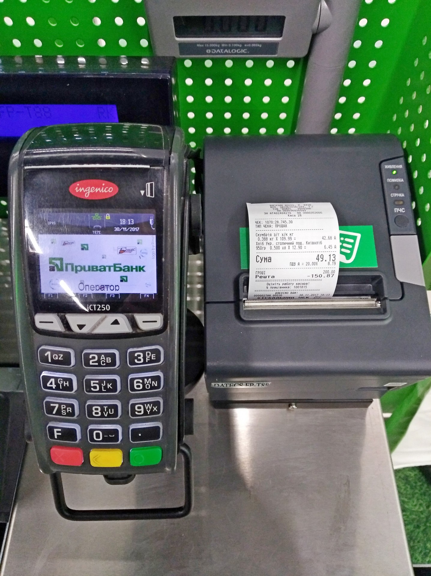 Після сканування товарів і оплати покупки, термінал видає чек і здачу.