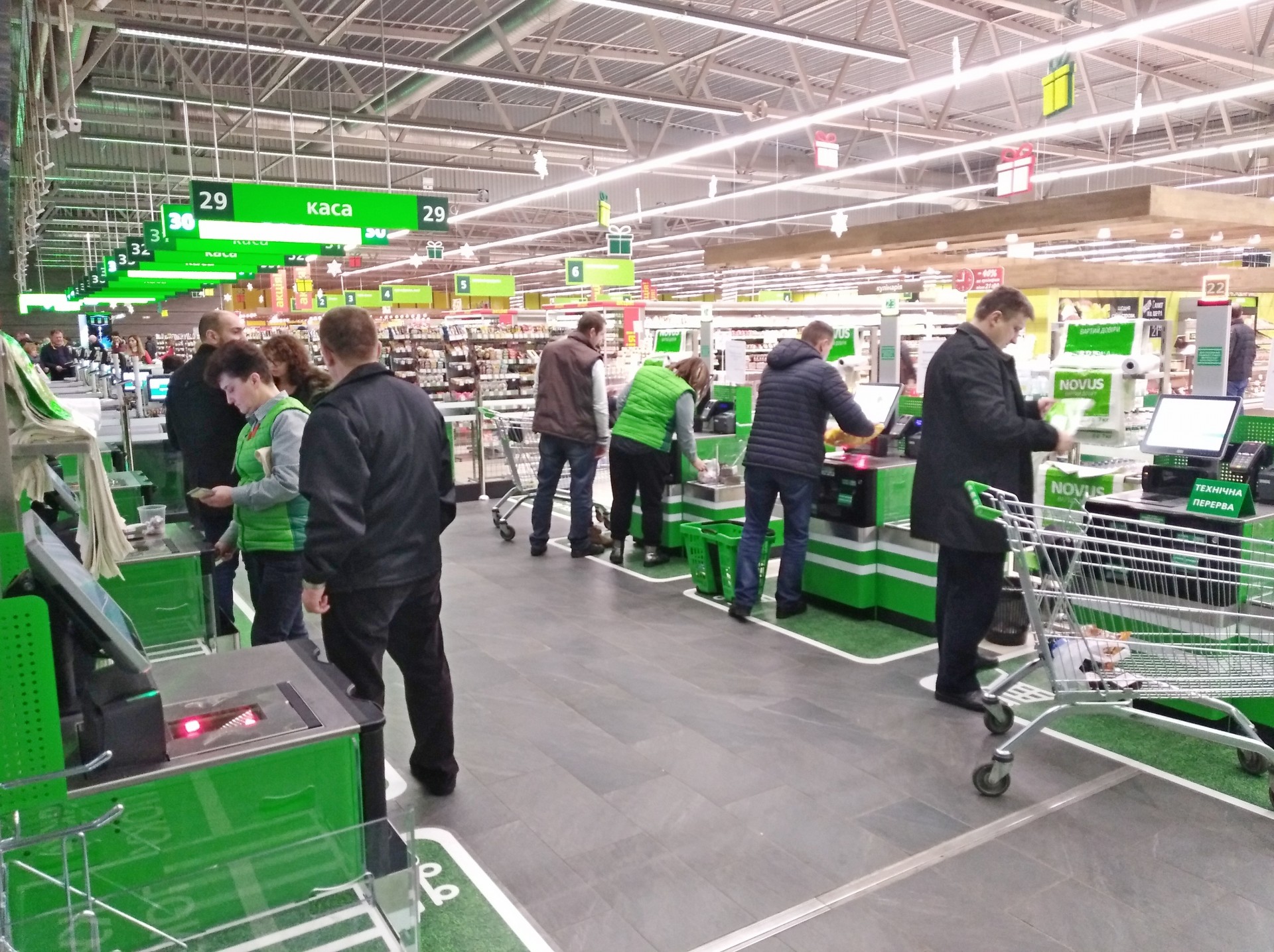 На касах самообслуговування покупець може самостійно сканувати обрані товари за допомогою вбудованого сканера, упаковувати покупки і оплачувати їх зручним для нього способом. У той же час, в залі з терміналами постійно працює кілька консультантів, які готові детально розповісти про роботу послуги.