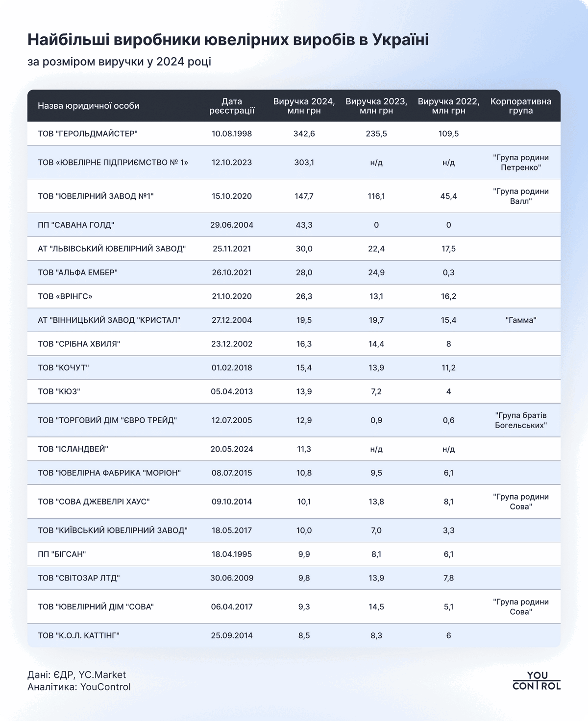 За даними дослідження, проведеного аналітиками YouControl, виторг українських ювелірних виробників в 2024 році зріс до 1,23 млрд грн. Це в 1,5 раза більше, ніж у 2023 році, коли показник становив близько 770 млн грн. Як зазначають дослідники, попри повномасштабну війну, галузь виробників ювелірних і подібних виробів зростає. Цей ринок в Україні є досить розгалуженим, з великою кількістю малих та середніх підприємств, а також кількома великими гравцями. Станом на жовтень 2025 року в Україні зареєстровано 622 юридичні особи та 855 ФОП, для яких виробництво ювелірних виробів є основним видом економічної діяльності. Переважна більшість юросіб (понад 32%) традиційно зосереджена в Києві (200 компаній), а також на Харківщині (79) та Вінниччині (51).