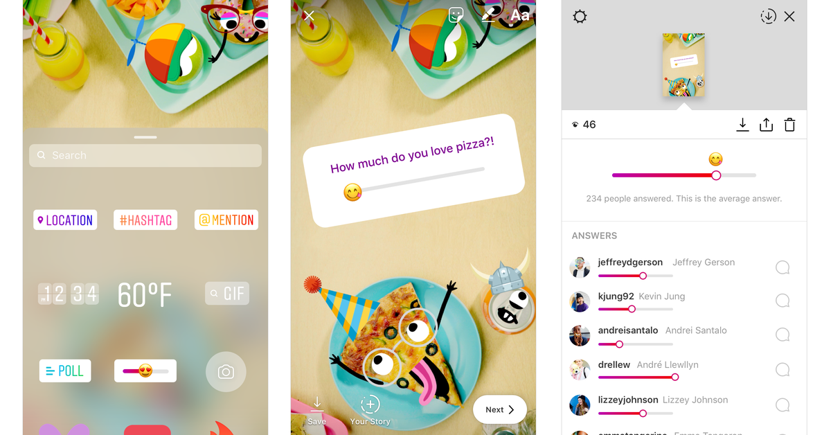 Новий стікер зі слайдером дозволяє проводити голосування в Stories-опитуваннях. Давати відповідь на запитання можна за допомогою пересування слайдера, який, по мірі руху бігунка, буде збільшувати смайлик. Власник Stories, в свою чергу, має можливість бачити середню оцінку користувачів і голос кожного користувача окремо. Emoji – слайдер можна знайти в параметрах Stories там же, де доступні gif-ки, хештегі та інше.