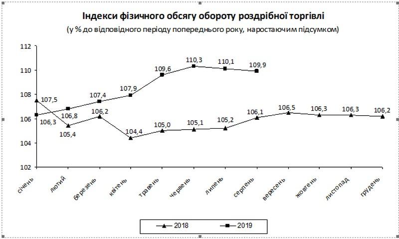 За даними Держстату, за 8 місяців поточного року фізичний оборот у порівнянні з 2018-м становив 109,9%. Якщо порівнювати з аналогічним періодом минулого року, то зростання пришвидшилося на 50%.