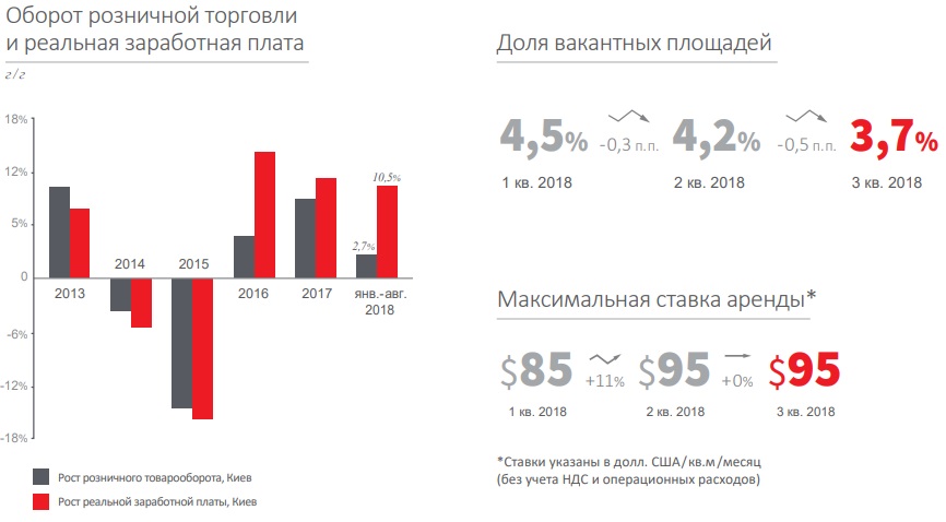 Міжнародна консалтингова компанія JLL представила новий звіт по ринку торгової нерухомості Києва. Як відзначають аналітики компанії, в III кварталі 2018 року нових якісних торгових центрів у Києві введено не було — обсяг ринку торговельної нерухомості залишився на рівні 1,037 млн кв. м, або 358 кв. м на 1000 жителів.
