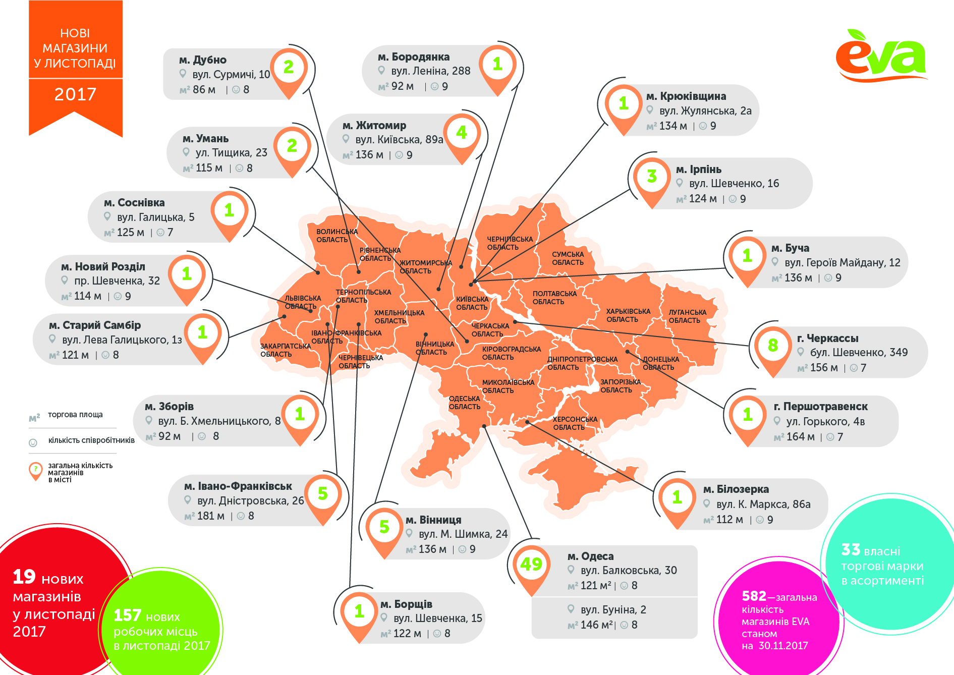 Продовжує активне масштабування мережі найбільший за кількістю магазинів drogerie-рітейлер України – EVA. У листопаді компанія відкрила 19 нових магазинів. Чотири торгові точки були відкриті в Київській (міста Ірпінь, Буча, Крюковщина і Бородянка) області, три у Львівській (м. Соснівка, Новий Розділ, Старий Самбор) області, по дві в Тернопільській (м. Зборів і Борщів) і Черкаській (м. Черкаси та Умань) областях, а також в Одесі. По одному магазину EVA в листопаді відкрилося в Рівненській (м. Дубно), Дніпропетровській (м. Першотравенськ), Херсонській (м. Білозерка) областях, а також в Івано-Франківську, Вінниці та Житомирі.