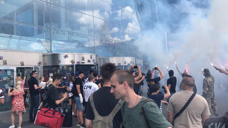 Приблизно о 15 годині кілька десятків представників націоналістичних рухів Січ і Свобода блокували вхід в Ocean Plaza, підпалили димові шашки та фальшфеєри.