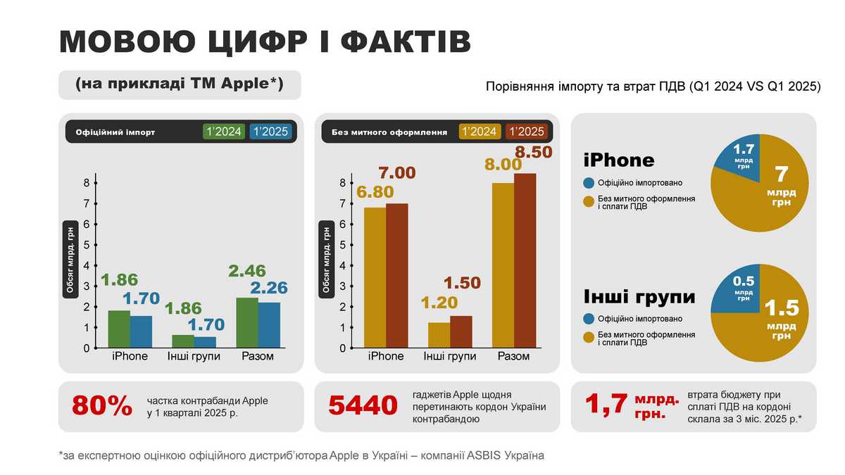 Якщо офіційно в Україну ввезено товару Apple на 2,2 млрд грн, то повз митне оформлення і без сплати ПДВ – на 8,5 млрд грн. Втрати держави від несплати ПДВ при імпорті колосальні – 1,7 млрд грн – і це тільки за І квартал 2025 року.
