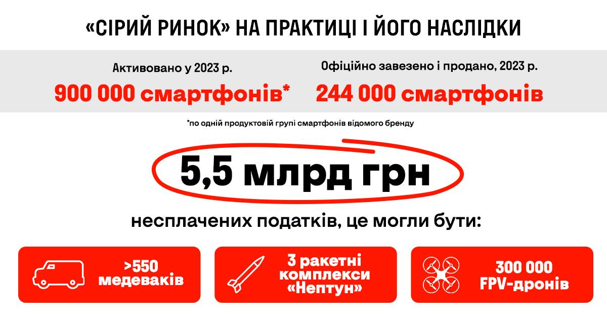 Як зазначили учасники круглого столу в Американській торговельній палаті, частка «сірого» ринку смартфонів лише одного з провідних преміальних брендів техніки у 2021 році складала 60%, у 2022 – 64%, а у 2023-му сягнула 71 %. І динаміка продовжується: тільки по одній продуктовій групі смартфонів у 2023 році було активовано в Україні більше 900 000 одиниць, а офіційно завезено і продано – 244 000. Тобто понад 600 000 смартфонів потрапили в Україну і реалізовані незаконним чином. Відповідно за 2023 рік тільки на цьому товарі держава втратила приблизно 5,5 млрд грн на несплаті ПДВ.