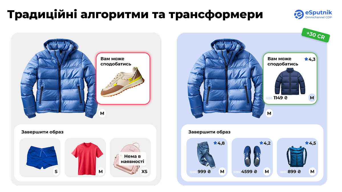 2. Товарні рекомендації на основі трансформерної моделі та LLM. На відміну від традиційних систем, які підбирають рекомендації за схожістю поведінки між клієнтами, ці алгоритми аналізують послідовність дій клієнта та здатні виявляти контекст. А великі мовні моделі (LLM) аналізують текстові описи товарів та будують семантичні звʼязки між ними. Це дозволяє працювати з товарами без історії покупок. Такі AI-рекомендації здатні генерувати до 20% продажів ритейлу, а їх ROI може сягати x10.