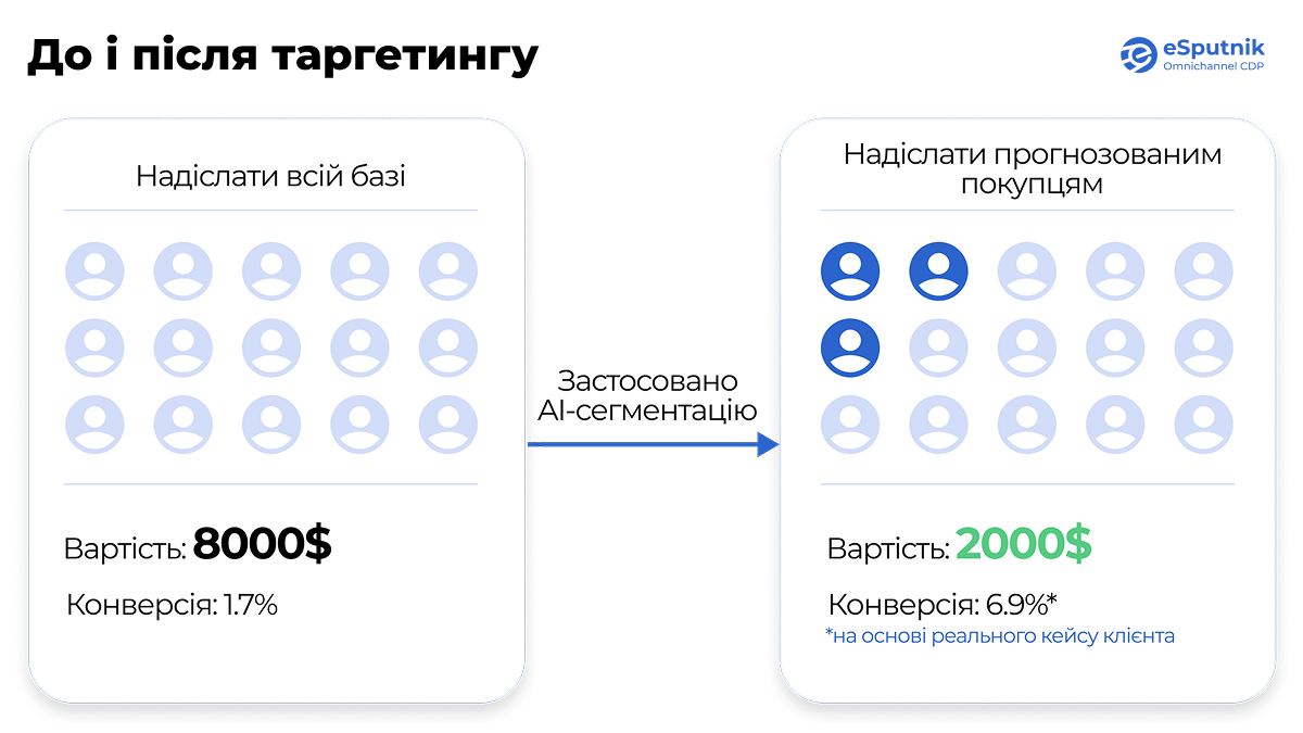 Компанії, які використовують предиктивну сегментацію, скорочують витрати на розсилки в дорогих каналах до 50%. Вони фокусуються на тих клієнтах, які вже готові до дії. Завдяки цьому інструменту, наприклад, український бренд одягу O.Taje отримав зростання конверсії на 300% і ROMI Viber-кампаній на 310%.