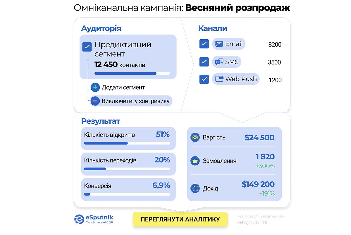 Як приклад, можу навести три кейси клієнтів eSputnik. Попри те, що в них були різні індустрії і різні задачі, їх обʼєднував спільний вектор: бажання отримати більше доходу з наявної аудиторії.