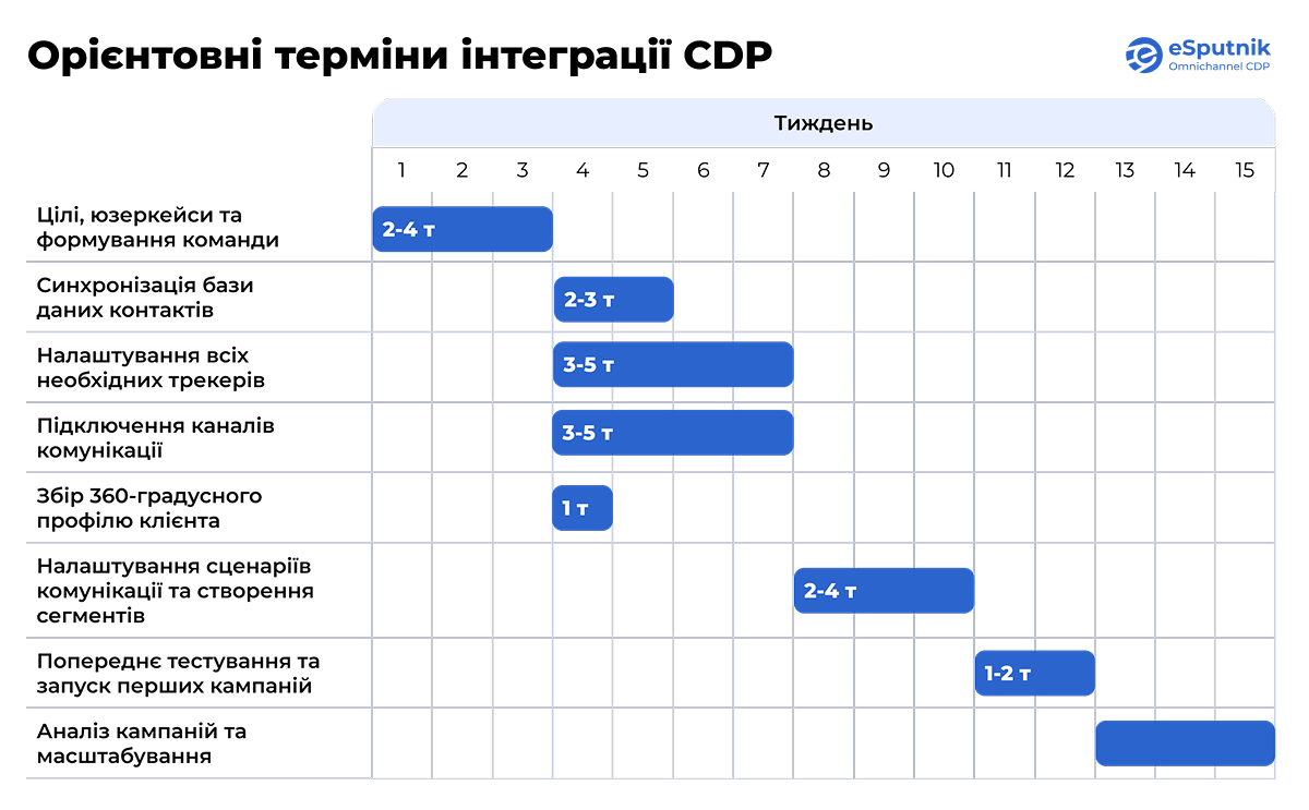 Загалом це залежить від масштабу бізнесу та його цілей. Наприклад, перші тригерні сценарії, наприклад, привітання з днем народження, welcome-серії, покинутий перегляд можна запустити за тиждень. А от на те, щоб повноцінно розгорнути платформу і побачити першу окупність, може знадобитися від одного до кількох місяців.