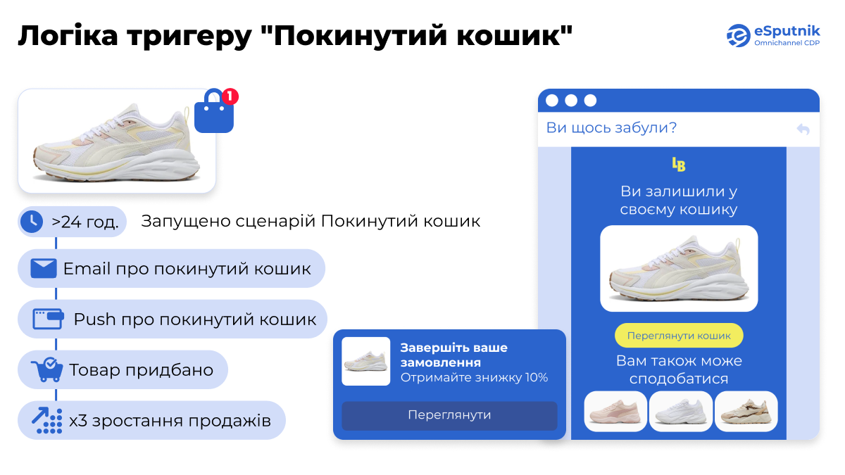 Кейси наших клієнтів підтверджують, що такі тригери повертають до 27% покупців і в середньому додають 10% до продажів.