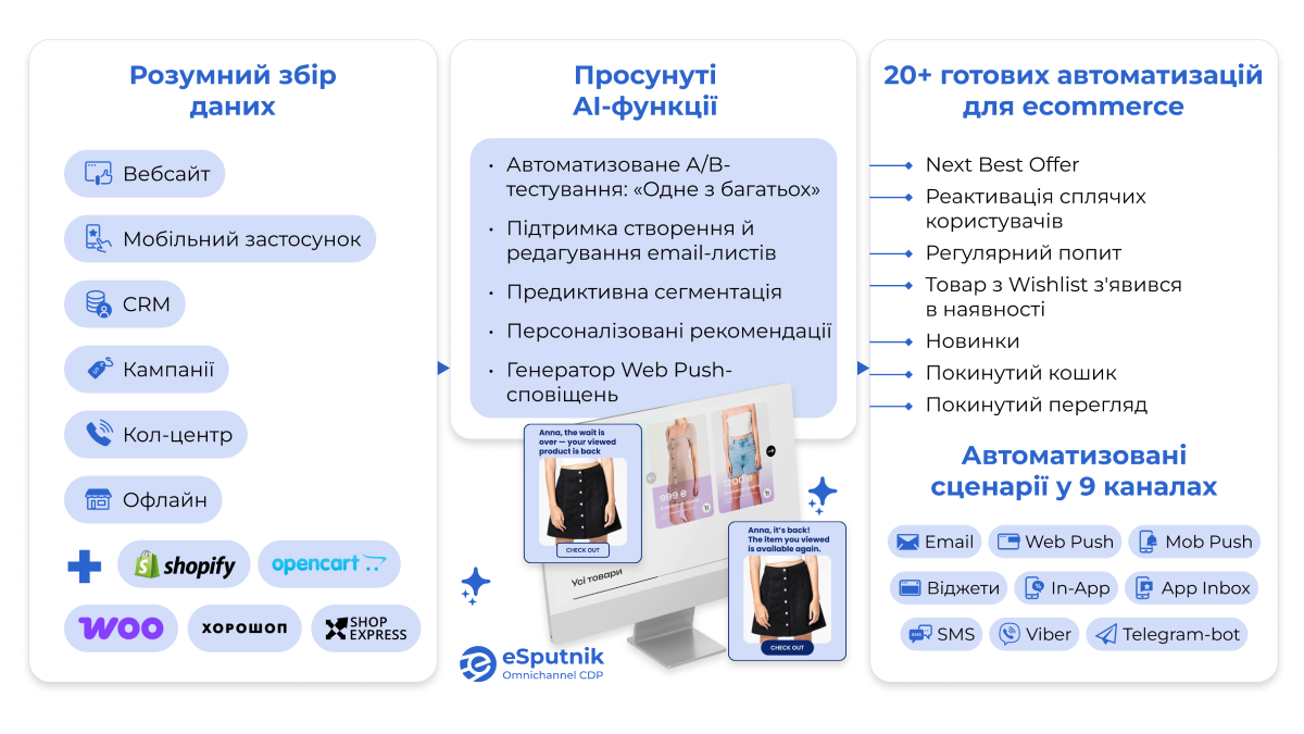 CDP eSputnik об'єднує 9 каналів в одній системі: Email, Viber, SMS, Web Push, Mobile Push, In-App, App Inbox, Telegram-бот, віджети. Всі ці канали мають доступ до профілю клієнта в реальному часі.