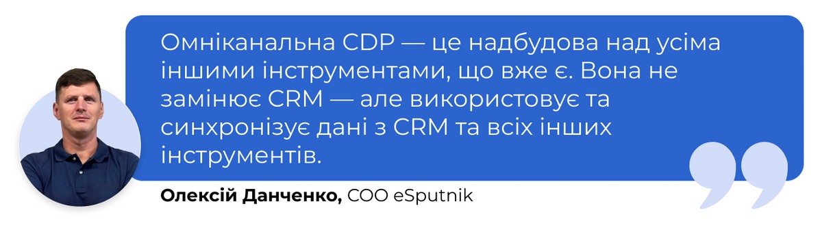 Водночас різниця між CRM і CDP є принциповою. CRM зберігає історію операцій: що саме придбали, коли, скільки це коштувало. Це допомагає відділу продажів, але цього недостатньо для ефективних маркетингових кампаній у реальному часі.