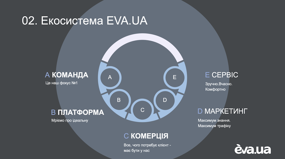 Онлайн-магазин eva.ua складається з окремих пазлів, кожен з яких відіграє свою роль. Команда – це головний фокус, оскільки робота над цим проєктом потребує величезної мотивації. Компанія має власний контакт-центр, єдиний KPI якого – розв’язувати питання клієнта, доки він їх має. Ми самостійно забезпечуємо розробку платформи, маркетинг за виключенням невеличких аутсорсингових завдань. Також ми самостійно здійснюємо доставляння замовлень. Зараз мета – забезпечити доставку замовлення в той самий день.