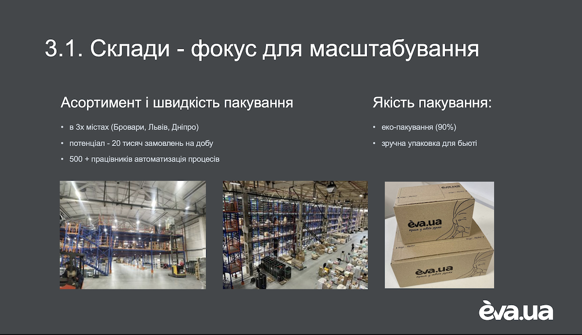Еva.ua багато інвестує у розвиток складської інфраструктури, оскільки це є необхідною умовою для досягнення лідерства в галузі. Зараз ритейлер має два великих розподільчих центри у Львові та Броварах, а також невеличкий кур’єрський хаб у Дніпрі.