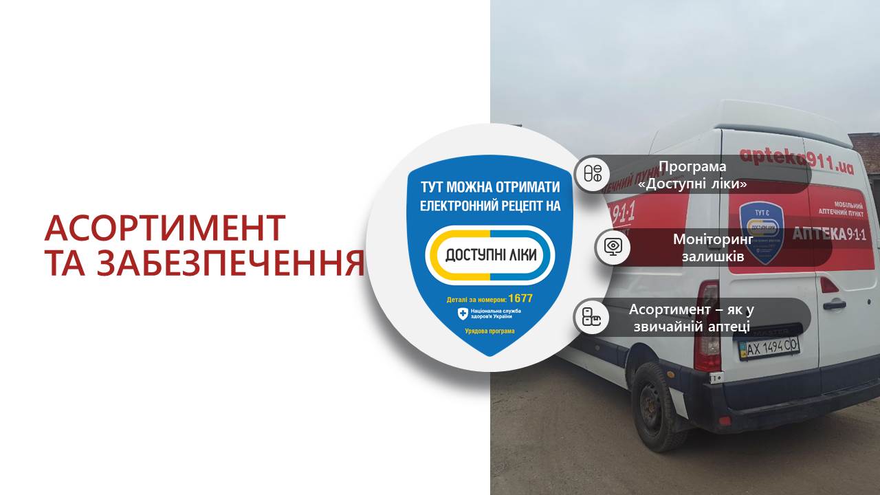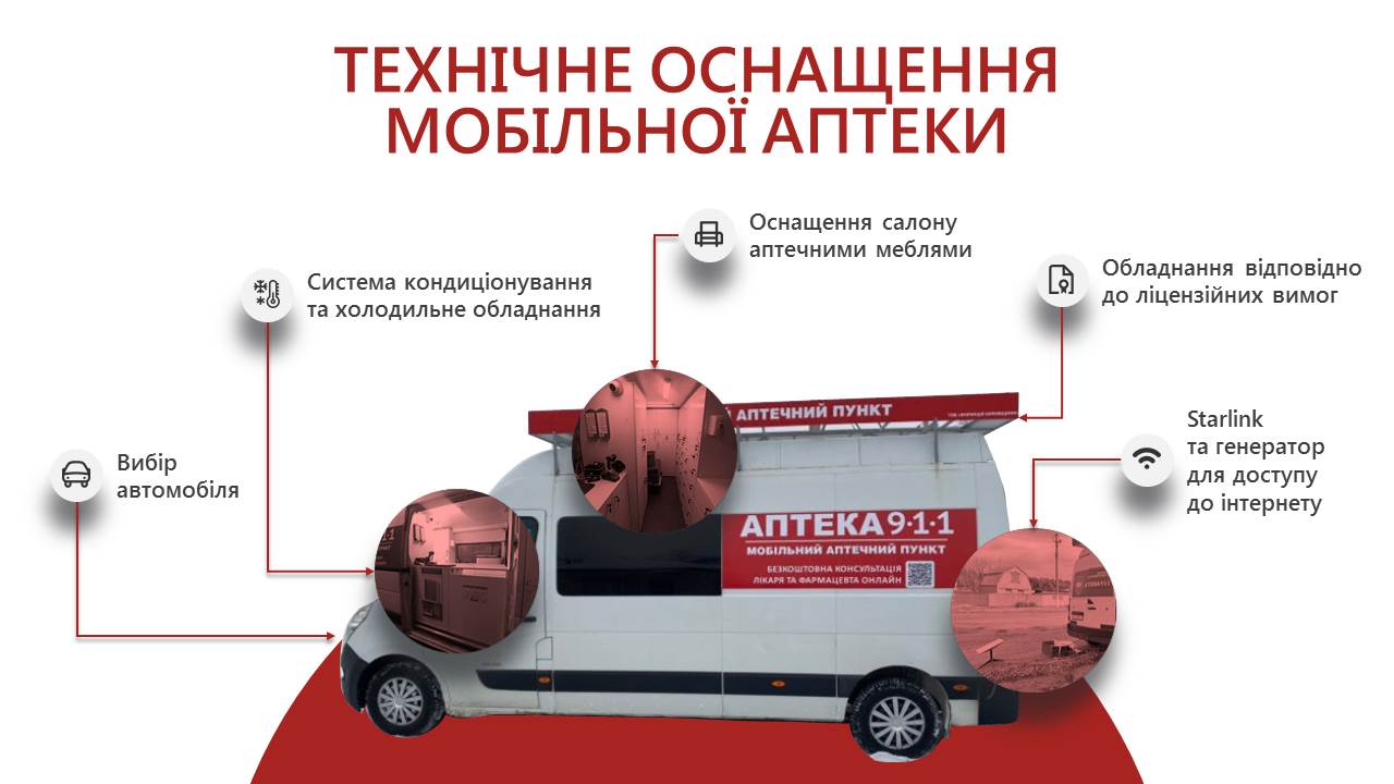 Звісно, досвіду запуску мобільної аптеки ні у кого не було, але потрібно було починати. В мережі Аптека 9-1-1 вивчили постанову уряду, і почали втілювати проєкт у життя. Тож мобільний аптечний пункт – це звичайний автомобіль, із системою кондиціонування та холодильним обладнанням, в салоні є аптечні меблі та обладнання відповідно до ліценційних умов, є Starlink та генератор для доступу до інтернету. В аптеці на колесах представлено 99,9% аптечного асортименту, такий самий підхід та обслуговування клієнтів.