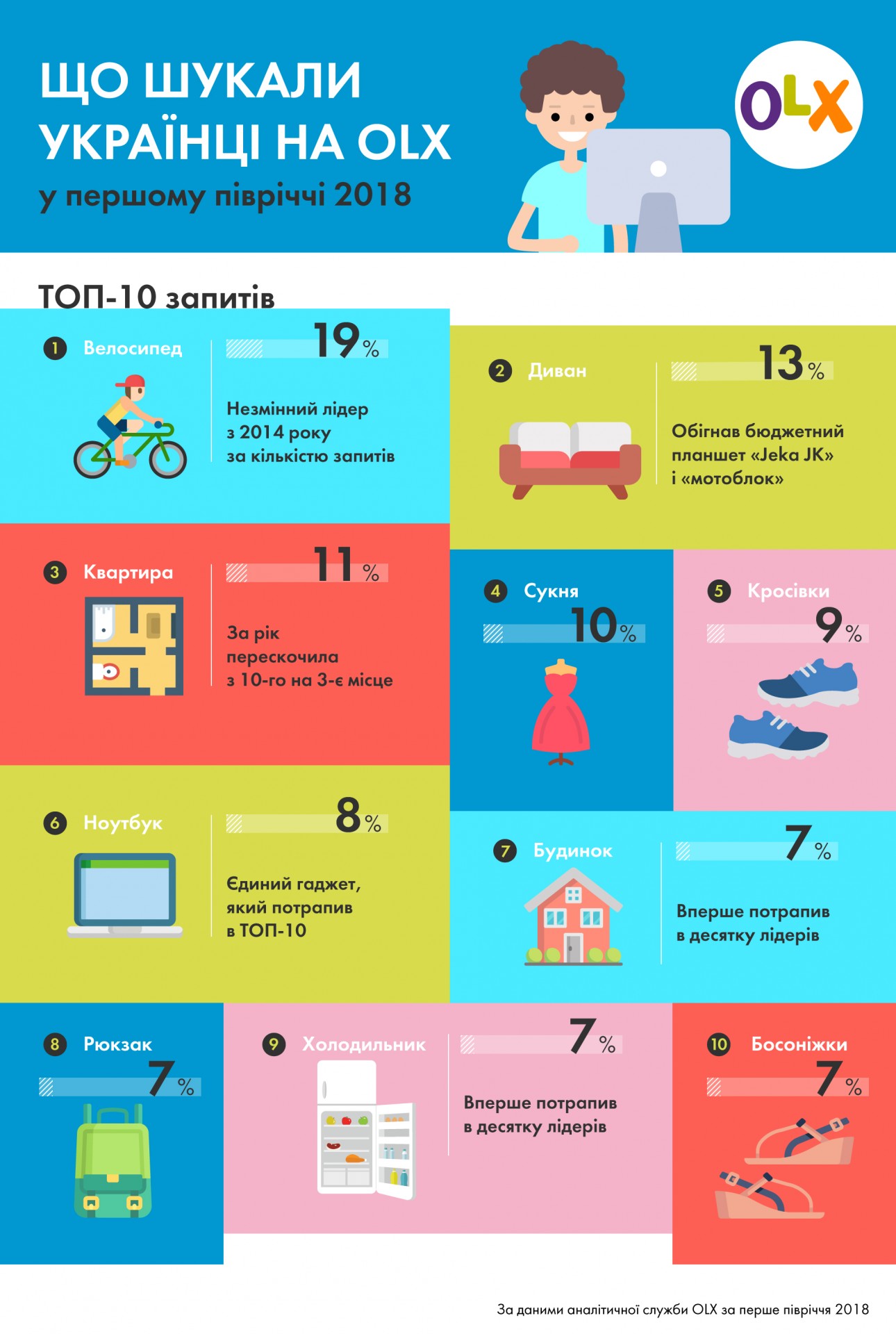 Так, в рейтингу ТОП-10 запитів «квартира» за рік перескочила з 10-го на 3-е місце, «будинок» і «холодильник» вперше потрапили в десятку лідерів, а «диван» обігнав бюджетний планшет «Jeka JK» і «мотоблок», перемістившись на другу позицію в рейтингу. Не припинили шукати на OLX одяг і взуття. Найбільше користувачів платформи цікавило «плаття», «кросівки» і «босоніжки». Незмінним лідером з 2014 року за кількістю запитів залишився «велосипед» – його шукали 550 667 разів.