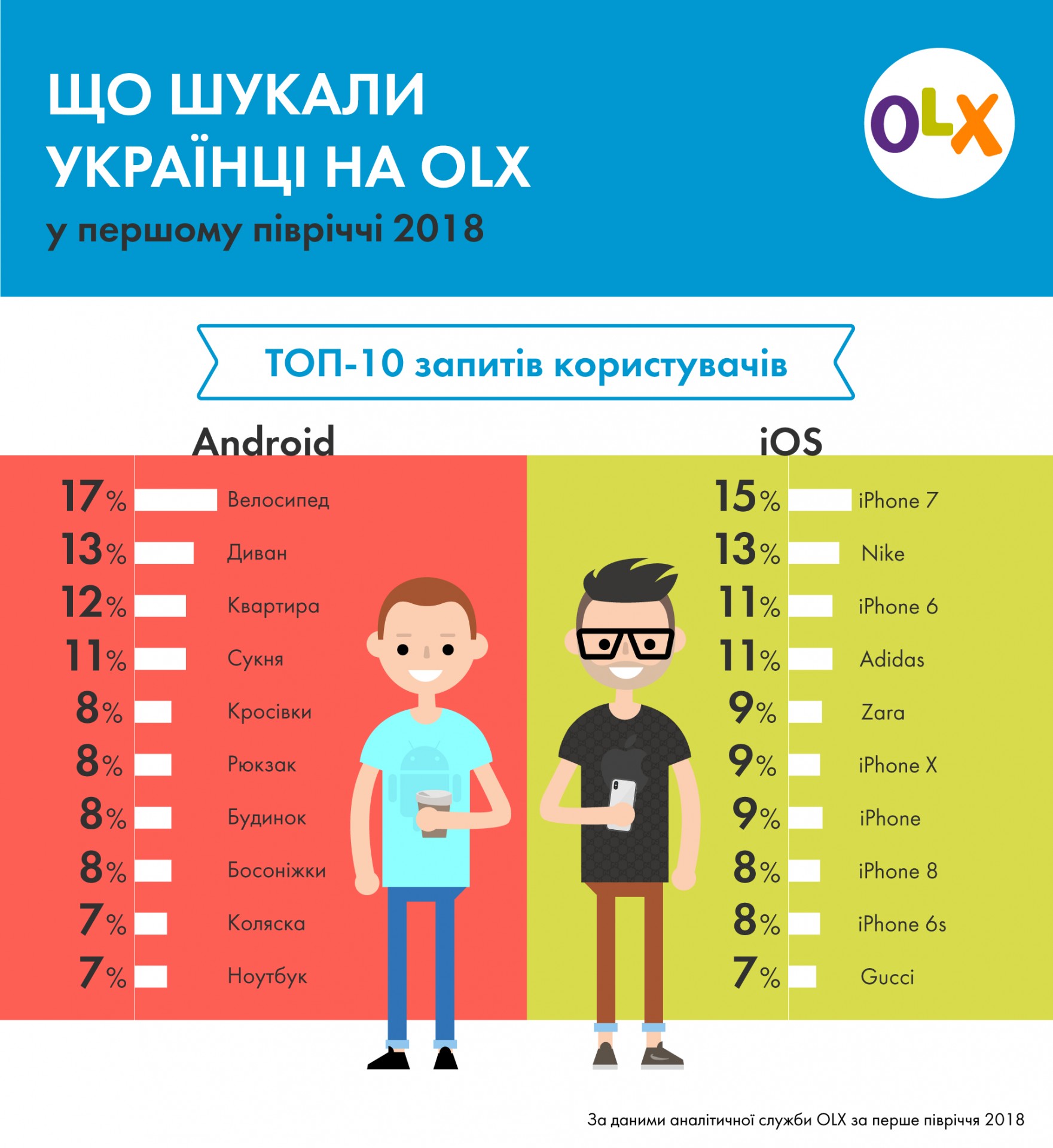 Власники техніки Apple продемонстрували непохитну вірність бренду та продовжують шукати на OLX моделі iPhone. Лідирує «iPhone 7» – близько 60 тис. запитів за перше півріччя 2018 року. Найчастіше користувачі iOS цікавилися «iPhone 6», «iPhone X», «iPhone 8» і «iPhone 6s». Разом зі смартфонами власники Apple шукали стильний одяг і спортивне взуття, роблячи запит на популярні бренди. Так, на другому місці рейтингу ТОП-10 запитів з iOS опинився «Nike», а на третьому «Adidas». «Zara» посіла 5 місце, а закриває ТОП-10 люксовий бренд «Gucci».