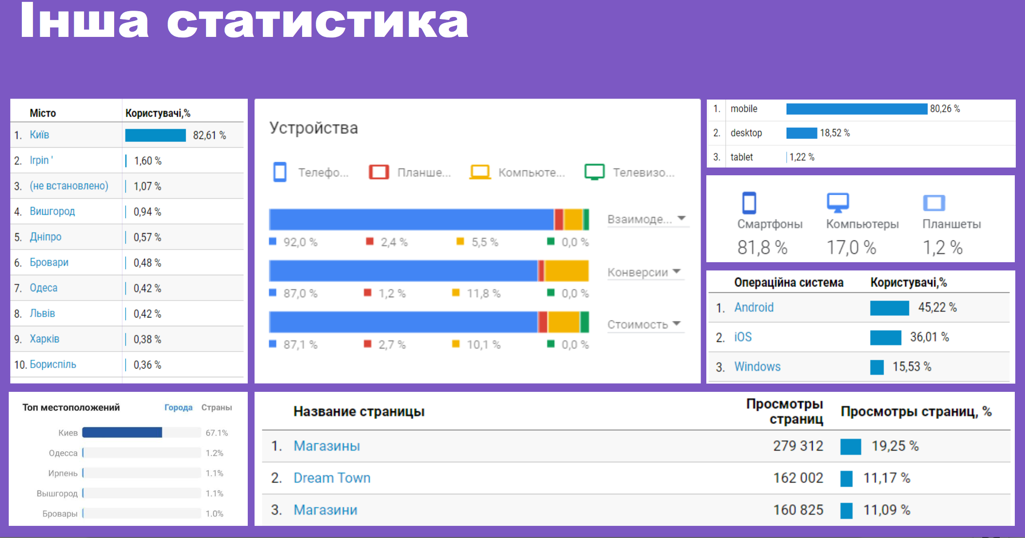 Цікаво, що незважаючи на те що ТРЦ є локальною точкою, його сайт і соцмережі відвідують люди і з інших міст. Частково це жителі міст-супутників, які є нашими відвідувачами та активними онлайн-учасниками. Але є й інші міста України. Спочатку у нас була гіпотеза, що це конкурсники, які полюють за безкоштовними призами. Але ця гіпотеза не підтвердилася, тому що такі користувачі через якийсь час відписуються від сторінки в соцмережі, або беруть участь виключно в конкурсах.