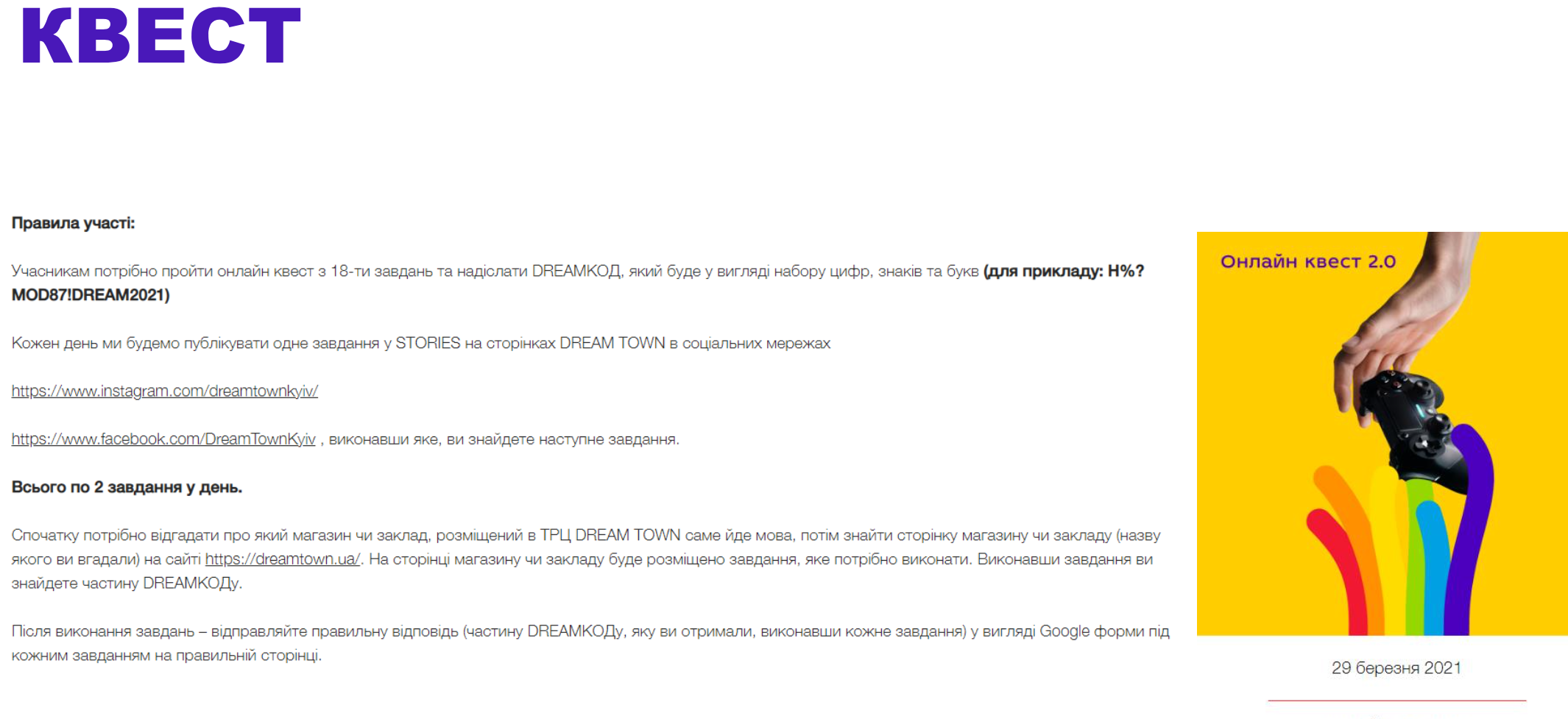 До пандемії в ТРЦ Dream Town вже був досвід проведення квесту, в якому були поєднані онлайн і офлайн ресурси. У ТРЦ була розміщена інформація з QR-кодами, які вели на сторінку з завданнями квесту. Самі завдання були розміщені в ТРЦ, але отримати їх можна було тільки онлайн.
