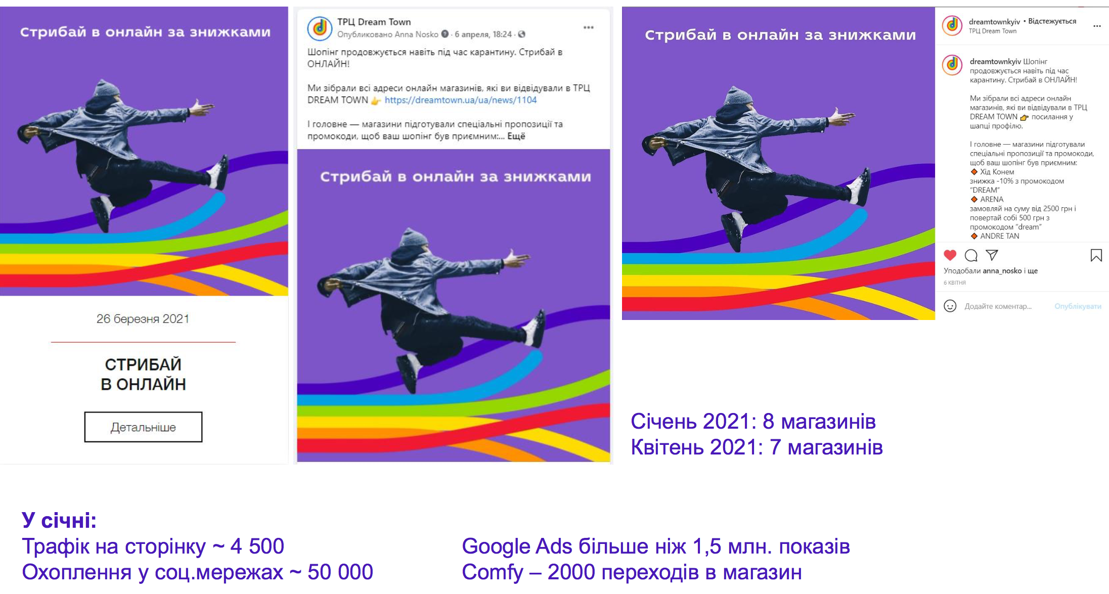 Під час січневого локдауну ми вперше запустили акцію з промокодом. Розуміючи, що ми не можемо генерувати трафік офлайн, ми вирішили поділитися своїм онлайн-трафіком з нашими орендарями. Ми попросили орендарів створити унікальний промокод для користувачів ТРЦ, який ми розмістили у себе на сайті, в соціальних мережах і гугл рекламі.
