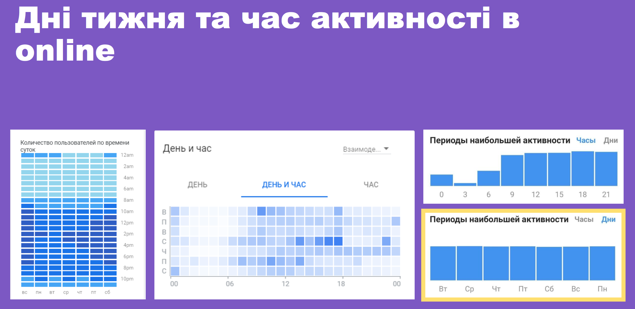 Дуже важливо знати не тільки якісний склад онлайн-аудиторії, а й найбільші періоди її активності. Це допоможе вибудувати правильну стратегію рекламних кампаній в соціальних мережах. Так, на вихідні краще нічого не планувати, тому що в цей час в соціальних мережах дуже низька активність. Також потрібно враховувати, що найбільша взаємодія з сайтом відбувається в середині тижня, а пік активності – друга половина середи.