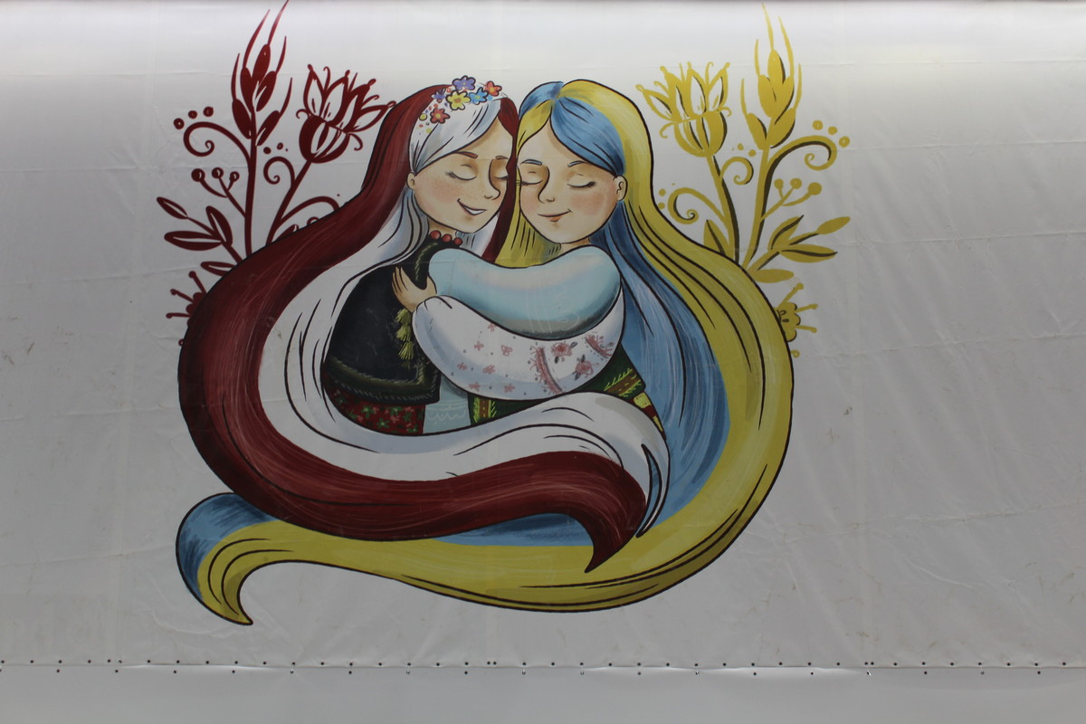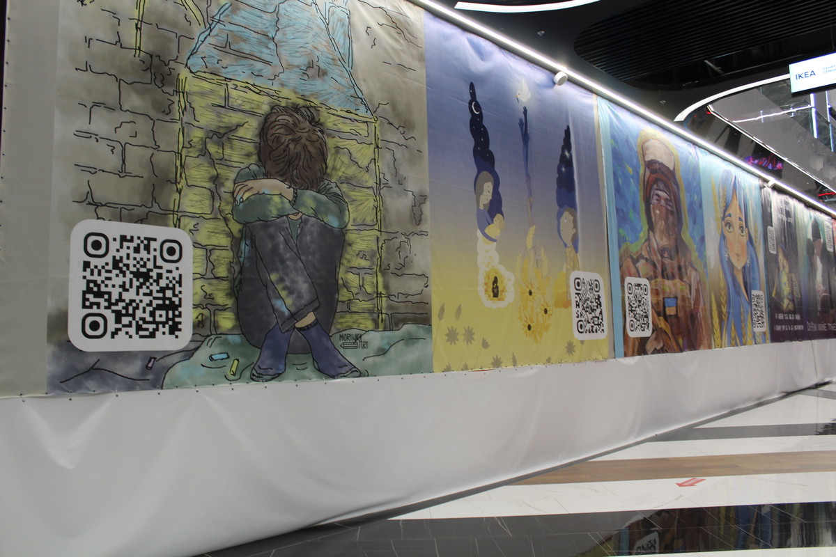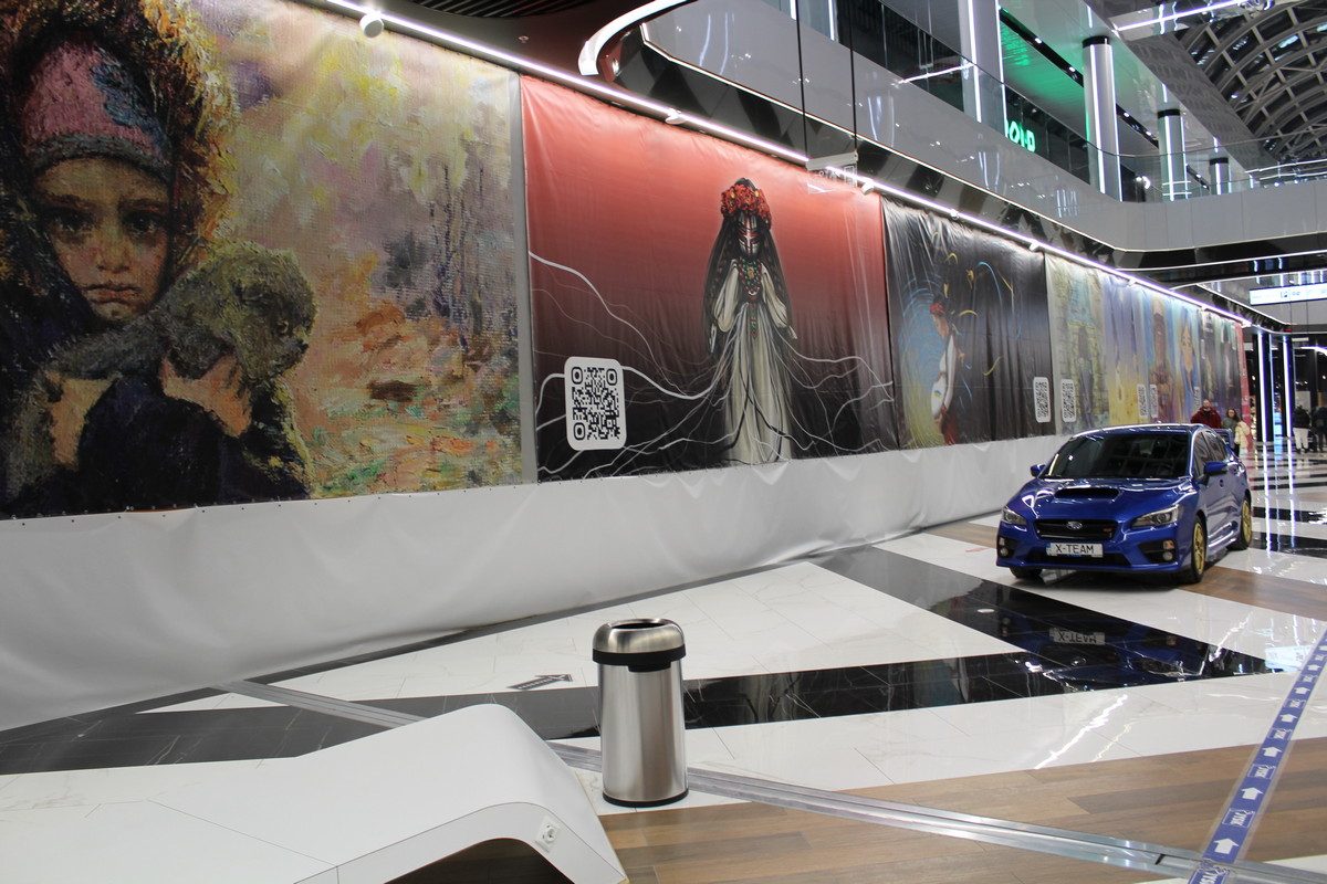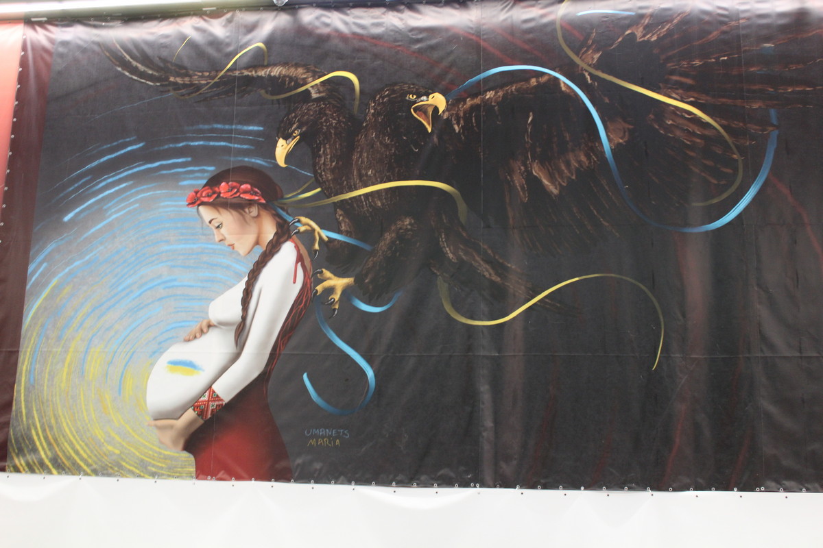Цікаво, що стіни декількох галерей, поки не зайнятих орендарями, прикрасили витвори вічизняних митців, присвячених Україні та тій непростій ситуації, в якій зараз опинилася країна.