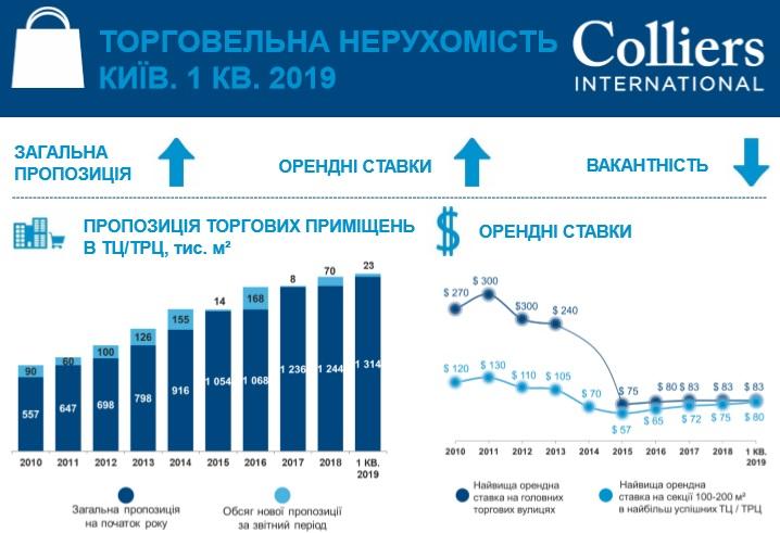 За даними компанії, станом на 1 квітня 2019 року в Києві функціонує близько 1,3у млн кв. м торгових приміщень в ТЦ/ТРЦ. У першому кварталі 2019 року нова пропозиція в столиці була представлена двома об’єктами: ТЦ Oasis (GLA 13 200 кв. м) і ТЦ Smart Plaza Оболонь (GLA 10 000 кв. м).