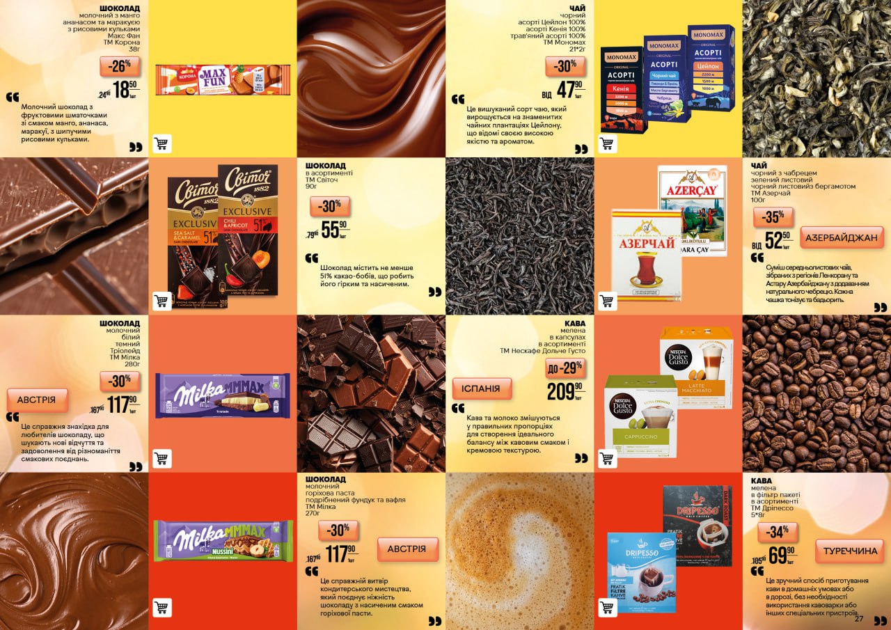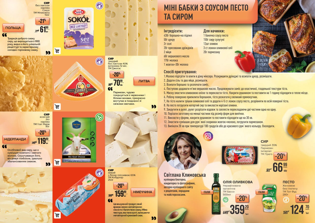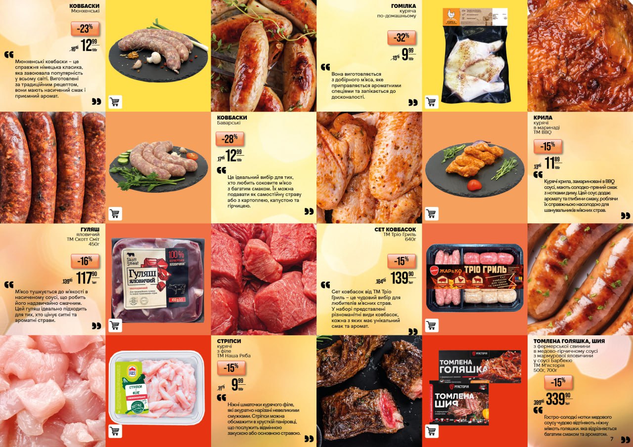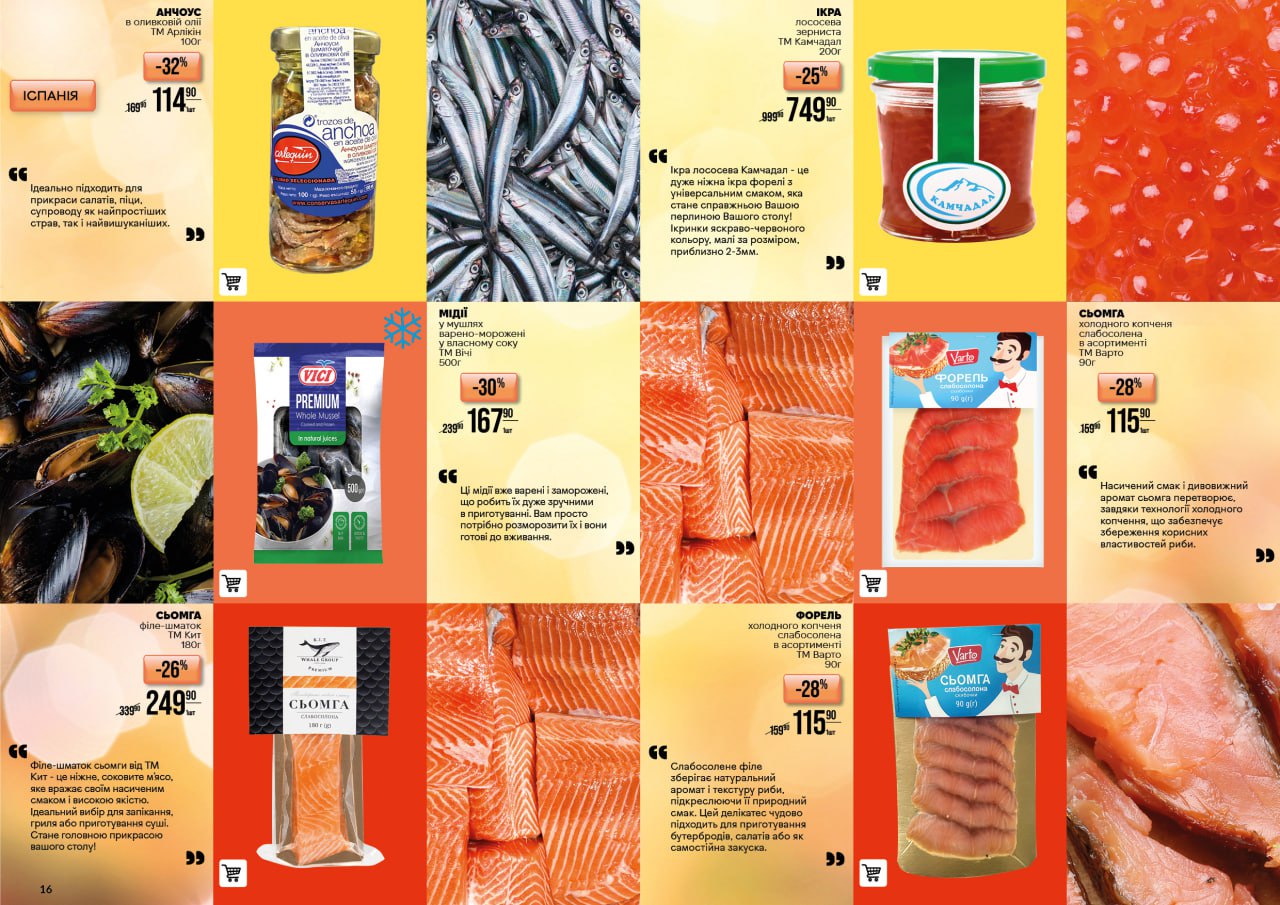 Серед акційних пропозицій — усе, що може знадобитись на кожен день та для особливої події: м’ясні та рибні делікатеси, різноманітні сири, алкогольні напої, солодощі та багато іншого.