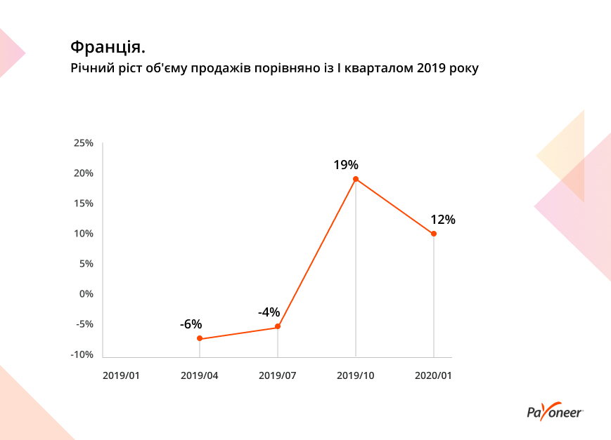 Протягом непростого I кварталу продавцям у Франції вдалося збільшити обсяг міжнародних продажів на 12% в річному вимірі. Це сталося, ймовірно, завдяки більш розвиненій екосистемі електронної комерції. З іншого боку, пандемія сильно вплинула на продавців Італії та Іспанії – їх обсяги продажів впали в два рази.