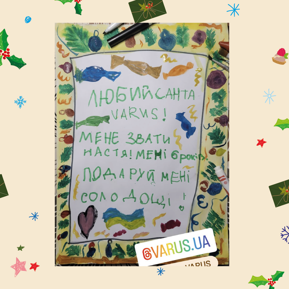 Напередодні новорічних свят Varus отримав понад 400 листів до СантаVarus від дітей. За підсумками конкурсу «Дитячі листи до САНТАVARUS», який проходив на офіційній сторінці в Instagram. У своїх листах українська малеча найчастіше разом із солодощами просила про перемогу та мир для України.