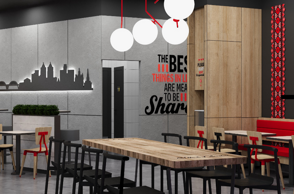 Команда повністю змінила дизайн, переосмислила зонування двох поверхів, а також додала нові формати для відпочинку й розваг. Заклад обладнали сучасними меблями та оновили колірну гамму — до фірмового червоного додані глибокі чорні та сірі акценти. В інтер’єрі органічно поєднані українські декоративні елементи, а одна зі стін прикрашена вже традиційною для мережі картою світу з позначкою міста Дніпро.