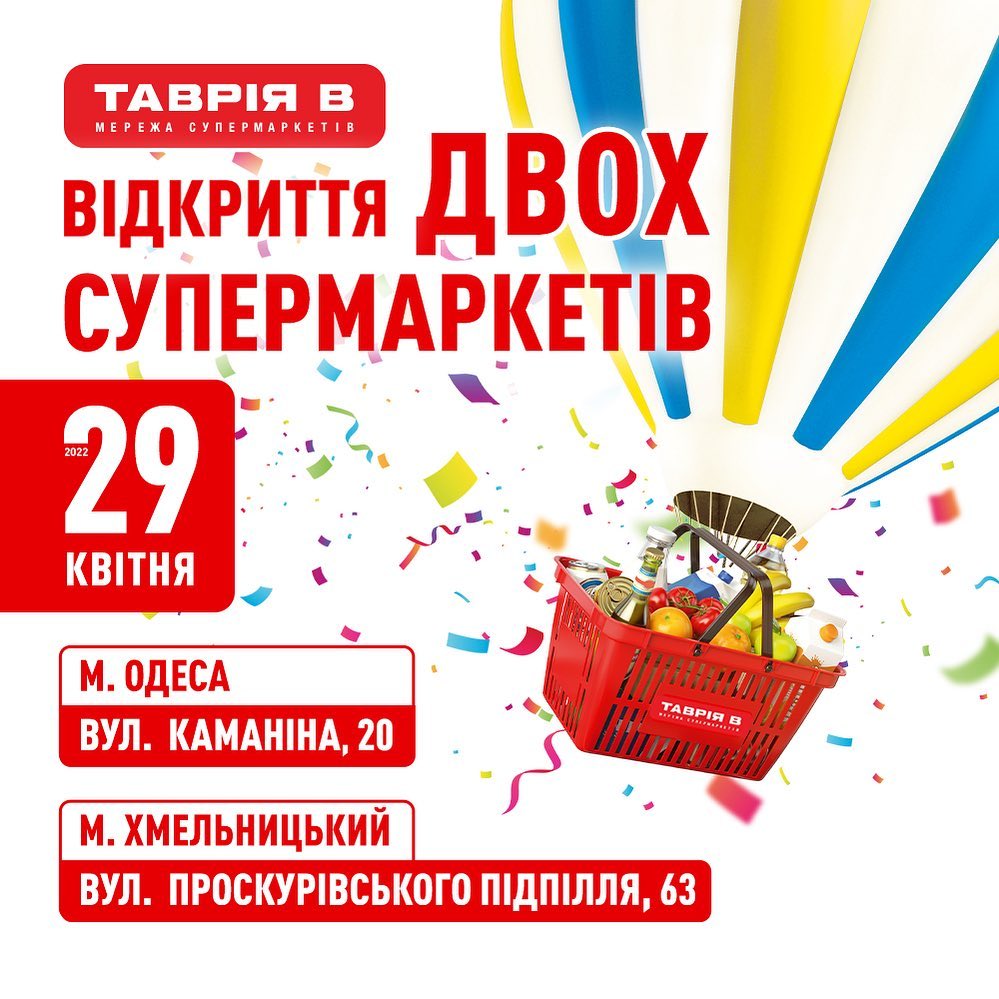 Одеська мережа магазинів Таврія В відкрила одразу два нових магазини 29 квітня. Перший з них знаходиться у м. Одеса, вул. Каманіна, 20, другий – у м. Хмельницький, вул. Проскурівського підпілля, 63.