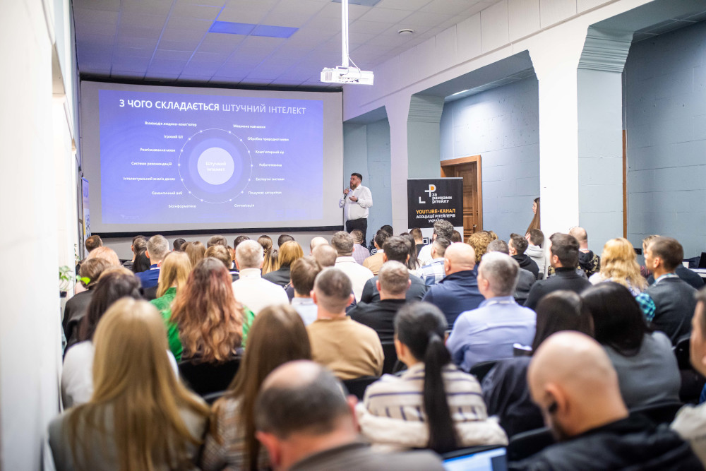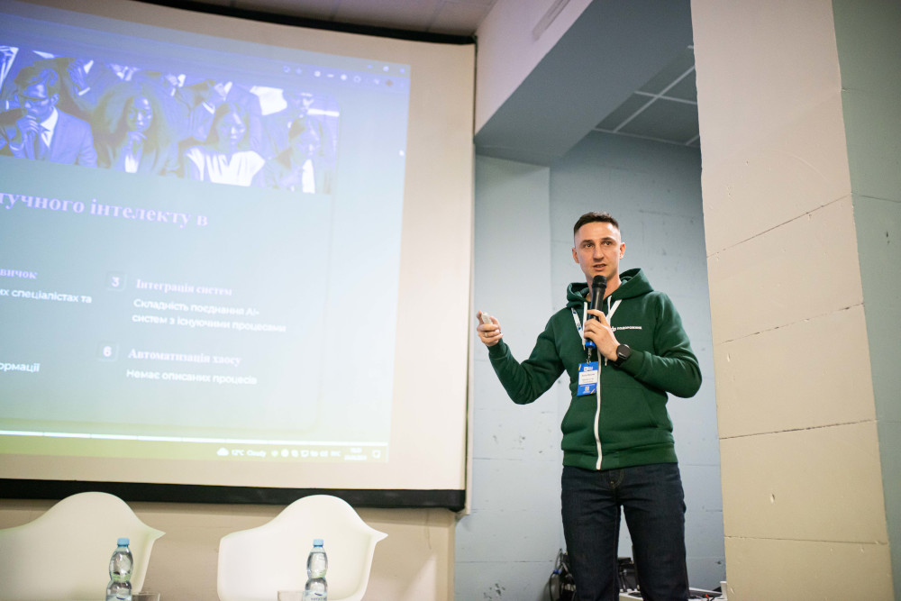 Після кава-паузи workshop продовжив Максим Пухов, директор департаменту інновацій Подорожник. Він поділився статистикою, що 79% людей в світі стикалися з ШІ, 22% – регулярно використовують його у своїй діяльності, 40% планує збільшити інвестиції в ШІ.