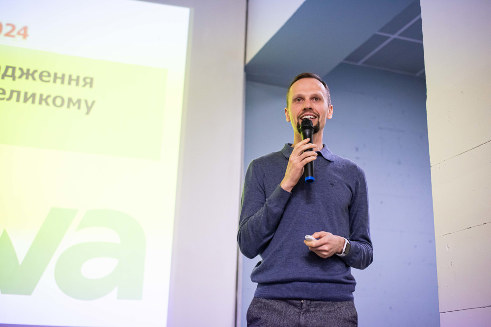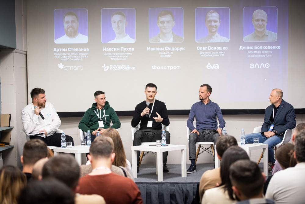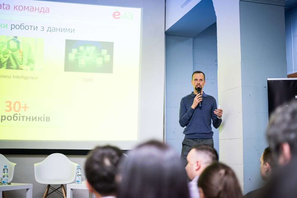 Далі виступив Олег Волошко, директор управління з обробки даних Eva. Він розповів, як впроваджували Data Science в компанію та вже мають понад 30 співробітників у відділі. Наразі Data Science залучений у різних сферах бізнесу, як-то: в продажах для прогнозування товарообігу, логістиці для керування персоналом на складах, комерції для прогнозування запасів акційних товарів, в e-commerce для динамічного ціноутворення, планування дати доставки тощо, в роботі HR-відділу для прогнозування терміну роботи касира-продавця.