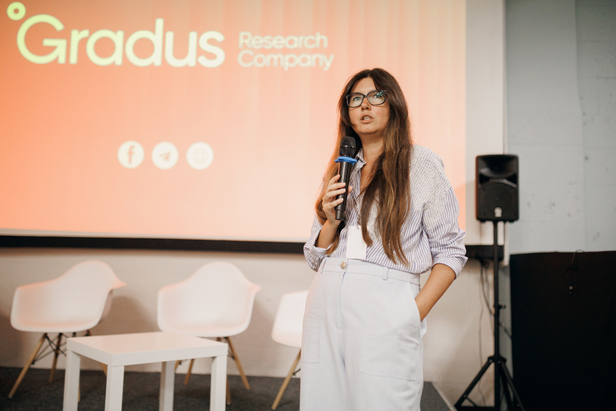 Першою з презентацією виступила Дар’я Нагаєва, Sales & Development Director Gradus Research. Вона презентувала результати дослідження, як українці адаптуються до тривалого стресу, нові моделі купівельної поведінки та зміни в життєвих пріоритетах. Зокрема, наразі 9 з 10 українців мають високий чи дуже високий рівень стресу. Структура витрат змінилася. Українці більше витрачають на харчові продукти, ліки та комунальні послуги. Натомість найбільше економлять на розвагах та побутовій техніці. При цьому молодь – покоління зумерів – витрачають більше на одяг, косметику та розваги.
