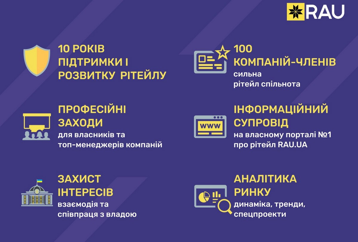 За 10 років існування RAU кількість учасників асоціації досягла символічної відмітки у 100 членів. І на цьому не збирається зупинятися. Сила будь-якої організації в її членах і наразі ми дуже сильні, ставши потужним об’єднанням провідних гравців ринку. Додатково наші сили загартовуються через випробування, які доводиться проходити. Зокрема Асоціація рітейлерів України насамперед зосереджена на проведенні спільних заходів для власників та топ-менеджерів компаній, захисту інтересів галузі шляхом взаємодії та співпраці з владою та щоденному інформуванні й підтримці учасників ринку через портал rau.ua. Також останні два роки динамічно розвивається YouTube канал «За рамками рітейлу» й напрямок аналітики галузі, якої так потребують рітейлери.