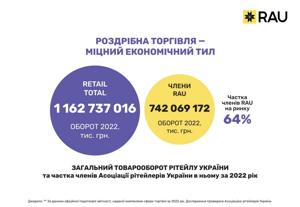 Значимість цієї роботи добре ілюструють цифри. Так, у 2022 році оборот компаній-членів RAU склав більше 742 млрд грн, що становить 64% від загального товарообороту рітейлу України (більше 1,16 трлн грн). Відповідно, із більш ніж 90 млрд грн податків, сплачених різними галузями рітейлу в минулому році, 56,6 млрд грн становить вклад членів RAU. Компанії, що входять до складу Асоціації рітейлерів України? забезпечили роботу 425 532 українців.