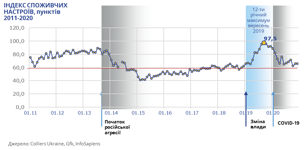 Для українського ринку рітейлу Індекс споживчих настроїв (ІСН) є одним із ключових індикаторів оцінки кон’юнктури ринку. Після досягнення 12-ти річного максимуму у вересні 2019 році (97,5 пунктів), з розповсюдженням пандемії, станом на грудень 2020 року, показник становив 65,7. Слід зазначити, що в 2014 році індекс знизився до 40 пунктів. Це був найнижчий рівень з часів фінансової кризи 2008 року (тоді показник складав 41 пункт).